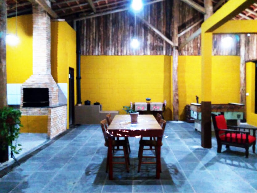 A casa e o salão forma um ambiente único, CLIQUE EM MOSTRAR MAIS. Na casa acomoda até 8 pessoas (Max) possui dois quartos, dois Bh interno uma suíte, tem estacionamento privado e uma ampla área de lazer para desfrutar com sua família. Ótima opção para quem deseja trabalhar em home office (wi-fi com boa velocidade) descansar e se divertir com seus filhos sem SAIR DE CASA, curtir uma piscina um futebol, sinuca, pebolim, um fogão a lenha e outros. A casa é bem aconchegante e familiar.