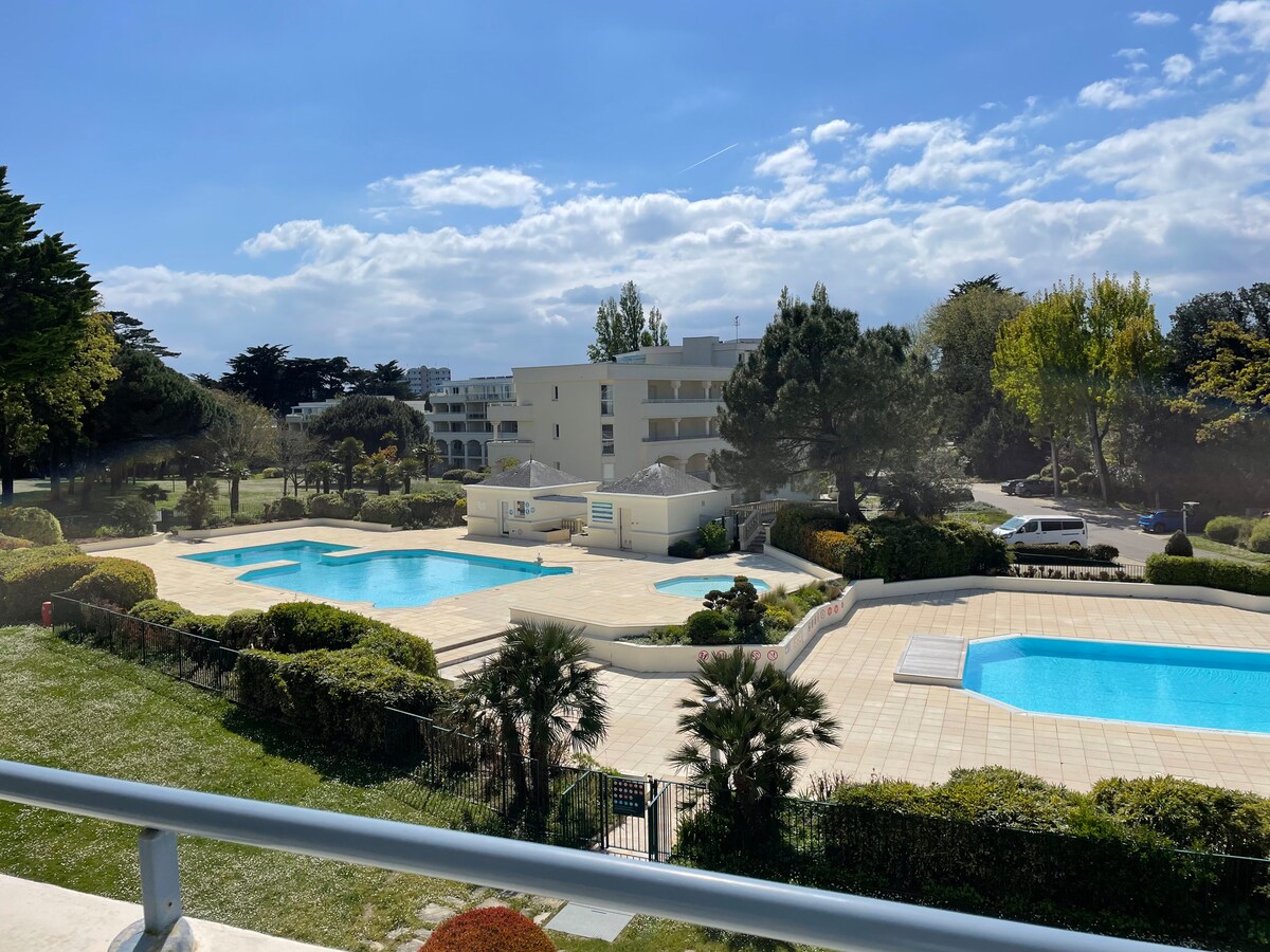 Apartamento em residência com piscina, no campo de golfe internacional de La Baule entre terra e mar, composto por: um quarto, uma sala de estar (sofá-cama, TV), uma cozinha equipada, um banheiro (banheira), um banheiro (chuveiro) wc, um terraço e um jardim (espreguiçadeiras, móveis de jardim, guarda-sol), bem como uma caixa. Roupa de cama fornecida O apartamento fica a 10 minutos do oceano. Calma e relaxamento garantidos! Acesso à piscina de 15 de junho a 15 de setembro.