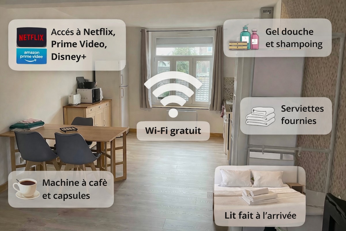 Bem-vindo ao nosso estúdio localizado perto da cidade velha e a poucos minutos de Nausicaa Nossa grande vantagem, a área de bem-estar com o SPA e sauna. Somos os únicos na área de Boulonnais a oferecer instalações profissionais e padrões sanitários A área de bem-estar está EXCLUSIVAMENTE à sua disposição. Este fica no térreo e o estúdio no primeiro andar do prédio. Fique à vontade para entrar em contato conosco no salão de beleza Art des Sens se quiser melhorar sua estadia