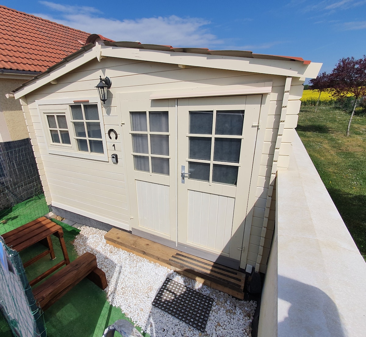 Nosso chalé de madeira está localizado na encosta de uma colina, em um pomar fechado de 2600 m². Anexo à nossa casa principal, este mini-loft é completamente independente. Oferece uma área de 42 m², é composto por uma área de estar (sofá-cama 2 x 80), uma área de cozinha (geladeira, forno, fogão a gás, micro-ondas, máquina de lavar louça), uma área de quarto e um banheiro com chuveiro e vaso sanitário. Terraço coberto de 20 m² com vista de 180 graus. Estacionamento gratuito.