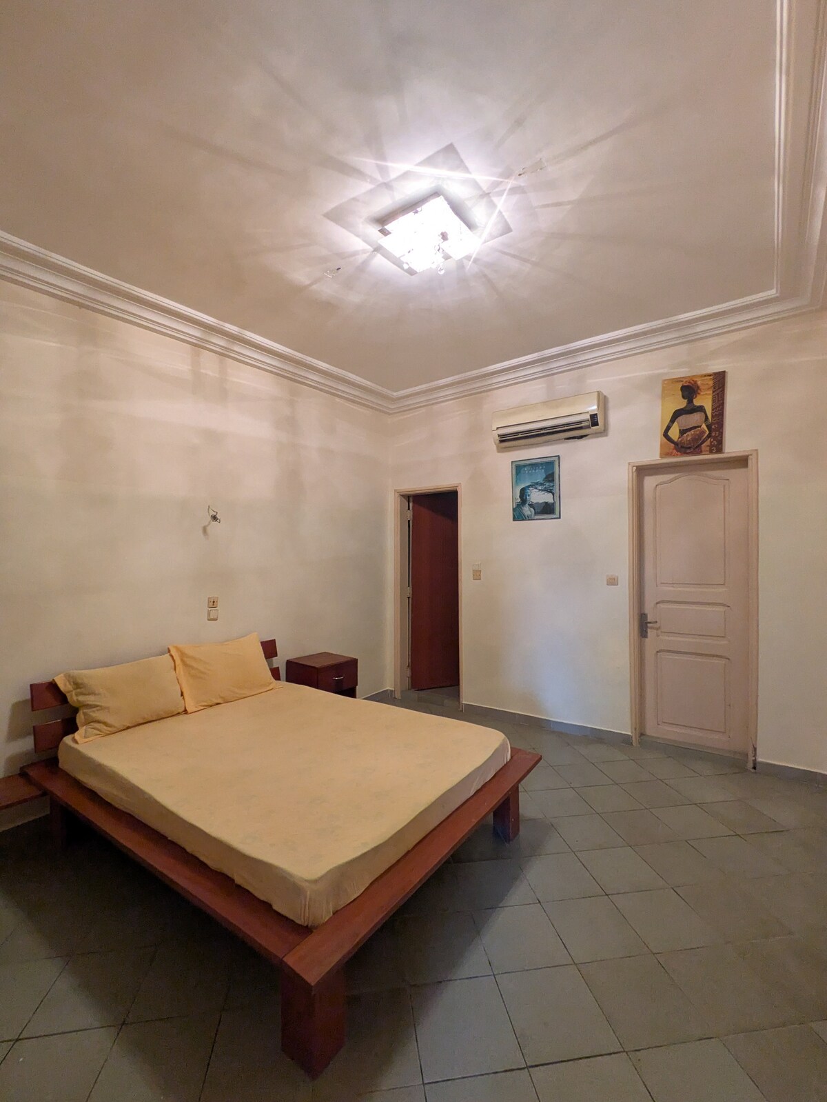 Appartement meublé entièrement climatisé avec 1 chambre lumineuse; situé au 1er étage d' un immeuble R+ 2 avec - une salle de bain équipée de Chauffe eau - Cuisine équipée avec toute la vaisselle - Connexion internet illimitée avec fibre optique - Abonnement Canal + avec chaînes internationales - Un balcon à l étage avec terrasse fleurie - Un agent de sécurité - Ménage une fois pas semaine - 15 kwh d'éléctricité offert ; au dela , vous paierez un complément pour votre séjour;