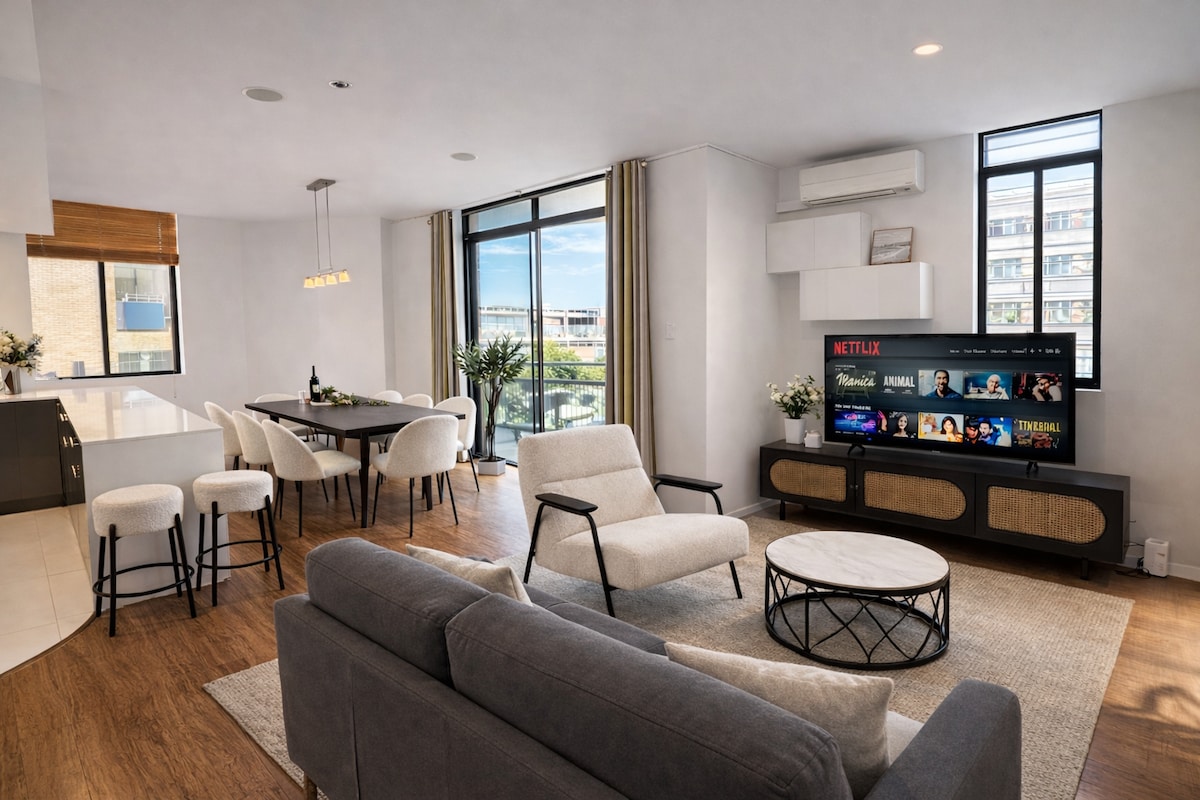 Penthouse with Natural Light Enjoy Sydney from above in this bright and spacious penthouse located right in front of the iconic Fish Market. With stunning views, elegant décor, and natural light all day long, it’s perfect for families or large groups seeking comfort and style. Just minutes from Darling Harbour and the city’s best restaurants, cafés, and attractions. ENJOY WITH US !!!