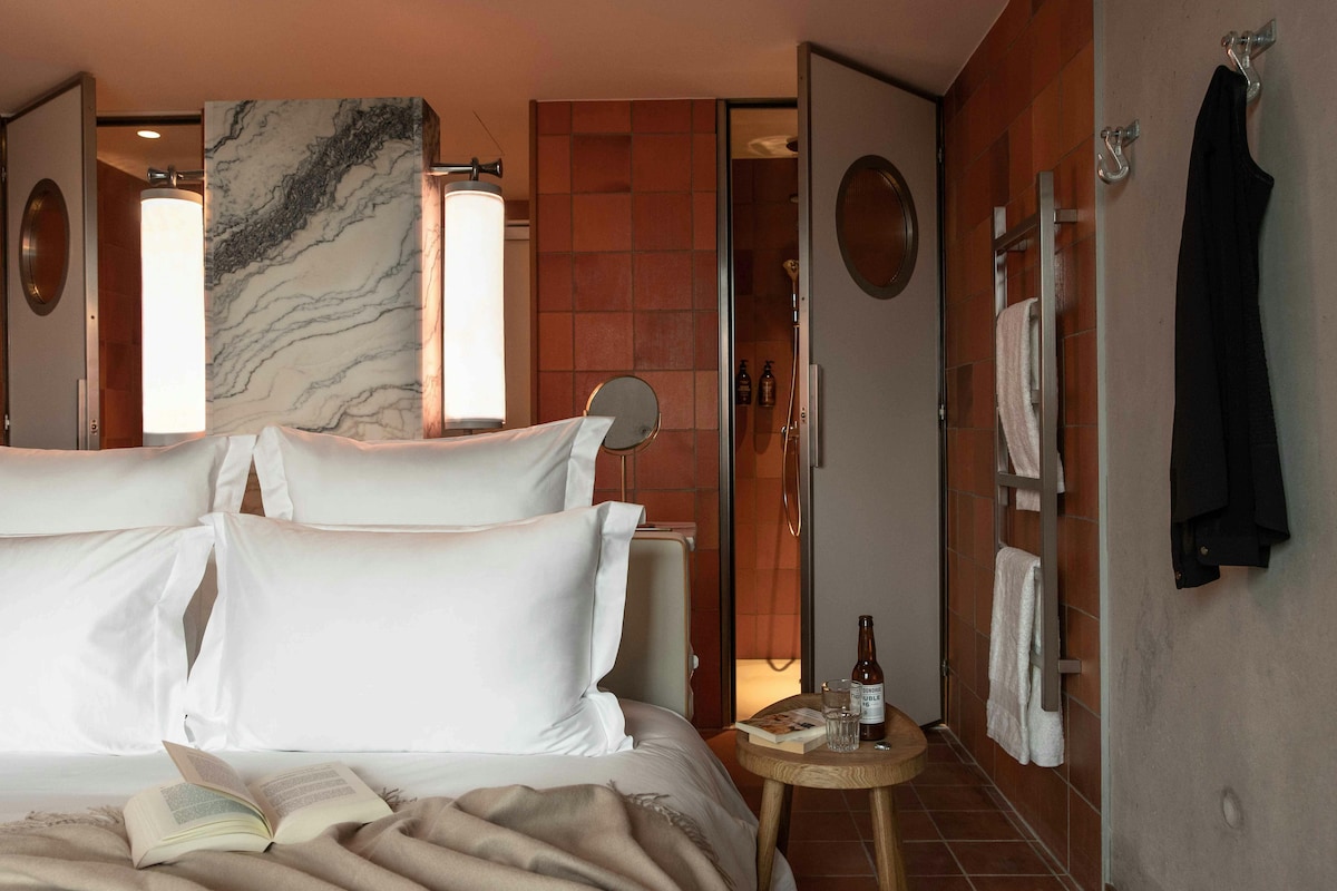 Este quarto dispõe de uma cama queen-size, banheiro privativo, mesa e espreguiçadeira em um layout compacto, mas confortável. Perfeito para viajantes que gostam de simplicidade com funcionalidade. Os hóspedes do Airbnb têm acesso à piscina no terraço e a várias comodidades do hotel. O imposto municipal de 8,45 euros/por noite/por pessoa será cobrado no hotel.