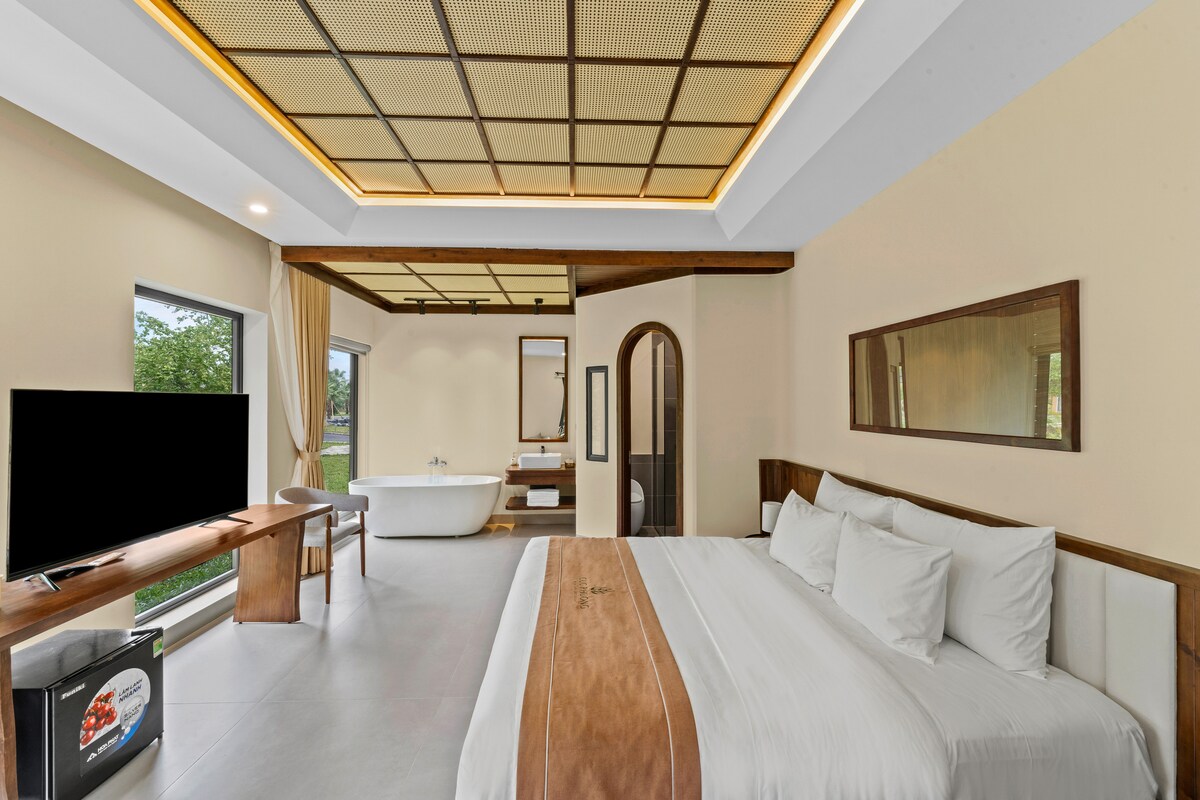 A luxury 4-star Deluxe Lake View King Suite designed for guests seeking refined comfort and tranquil surroundings. This 30m² suite features a private entrance, standard air conditioning, soundproof walls, and a spacious 2m x 2m king bed. Enjoy calming lake views from the room and a luxury ensuite bathroom with both a walk-in shower and a bathtub, plus a flat-screen TV with cable channels. A peaceful, elegant retreat crafted for total relaxation.