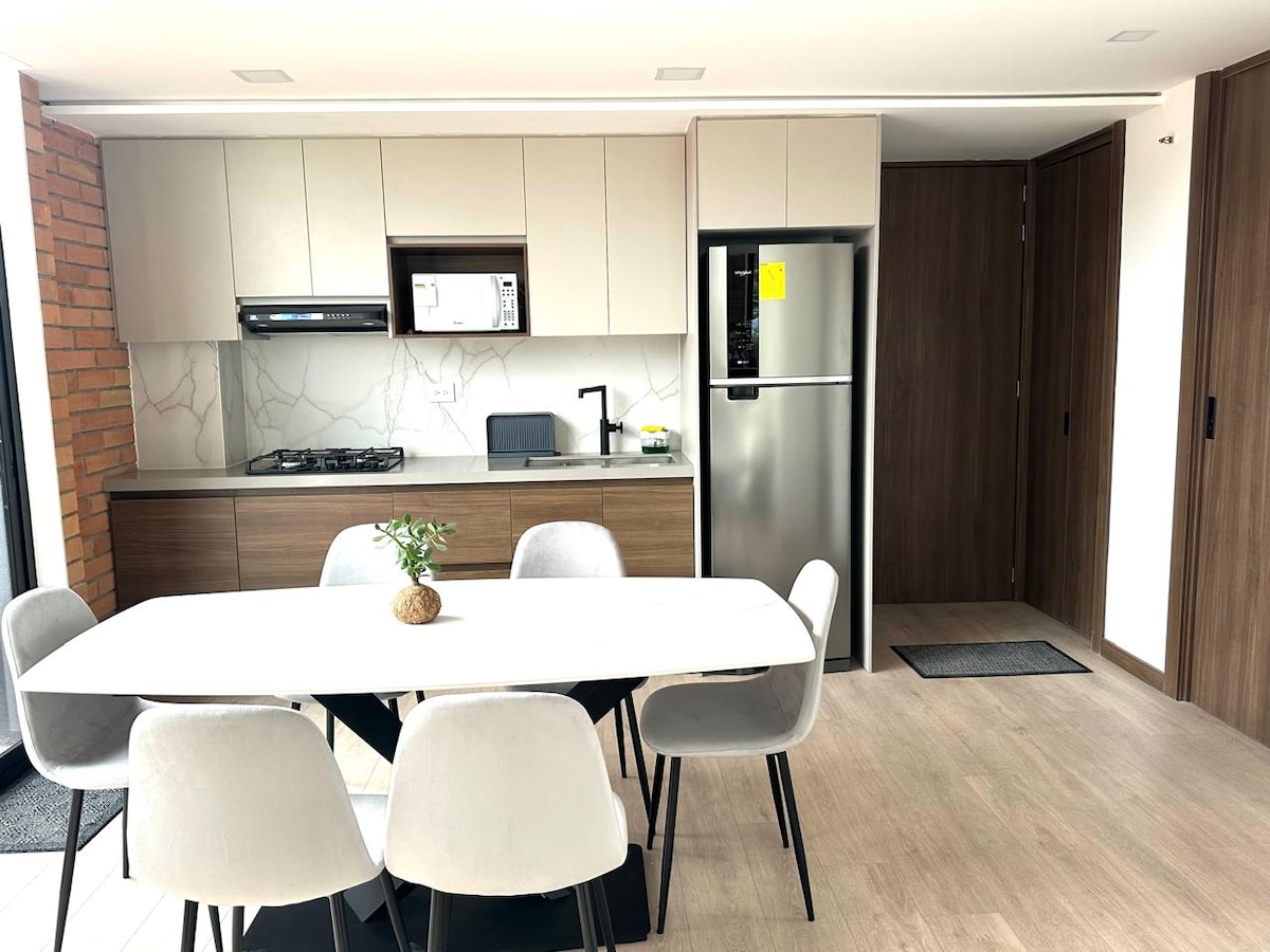 Este elegante alojamiento es ideal para noches de pareja, familia corta o estadías largas de trabajo. Contamos con jacuzzi dentro del departamento, chimenea de bioetanol y una sala con una pantalla de 85” para las mejores noches y experiencias inolvidables de sus vacaciones. Cama tamaño king y hermosos balcones. Cocina propia con todos los implementos necesarios. Cerca de lavanderías, tiendas, restaurantes. Parqueadero propio y cámaras con vista a la calle para su tranquilidad.