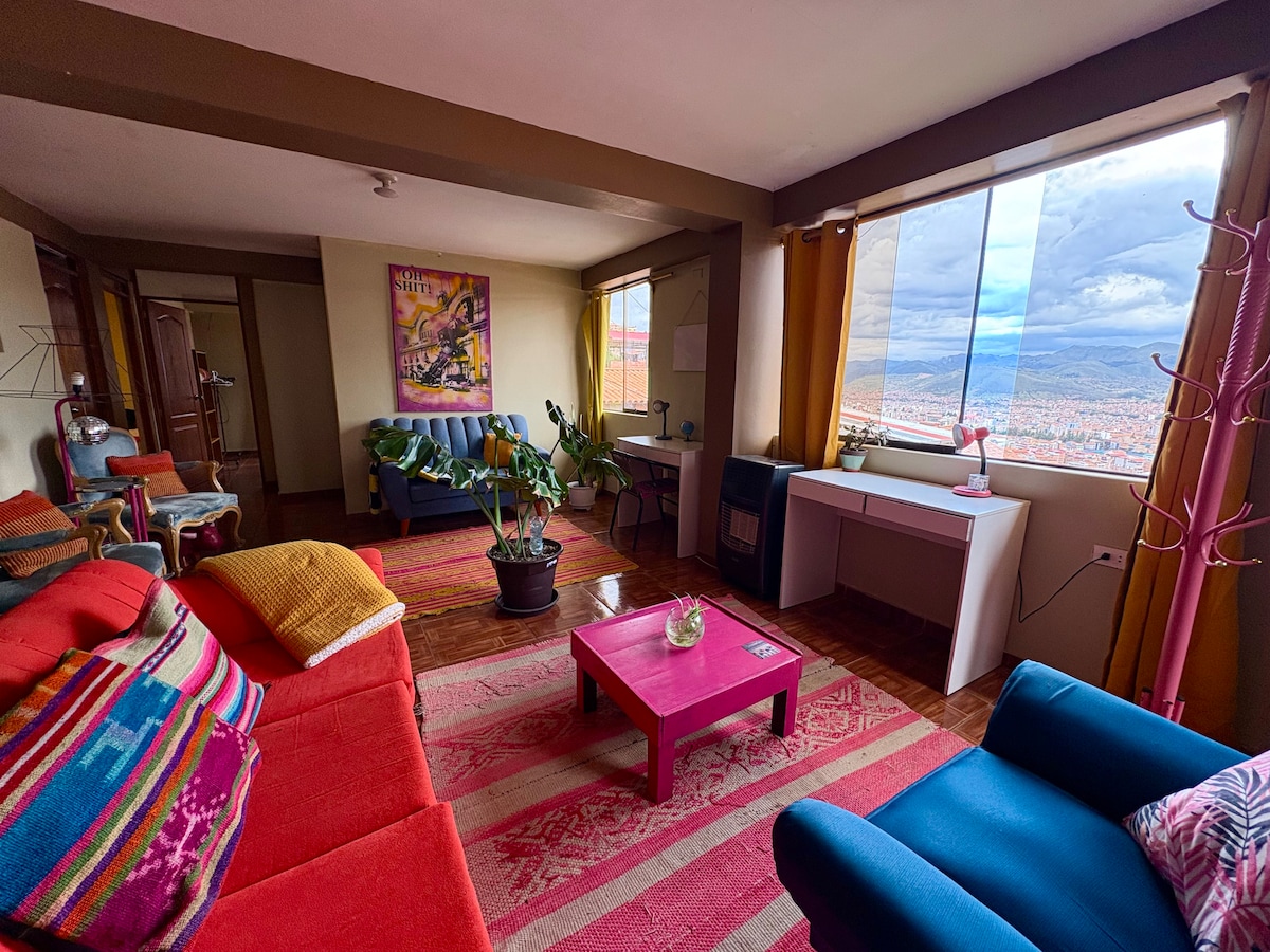 Apartamento com uma bela vista de Cusco. Localizado no bairro tradicional de San Blas, é um local ideal para casais e famílias. Aqui você encontra atividades para a família, vida noturna, museus interessantes, igrejas encantadoras. Estamos a apenas 5 minutos da praça principal. Você vai adorar o nosso espaço devido à localização, a cama confortável, o aconchego, a vista incrível, a sensação de casa. Podemos oferecer-lhe TRANSFER E TRANSFER DO AEROPORTO, além de também contarmos com uma AGÊNCIA DE VIAGENS confiável com equipe profissional
