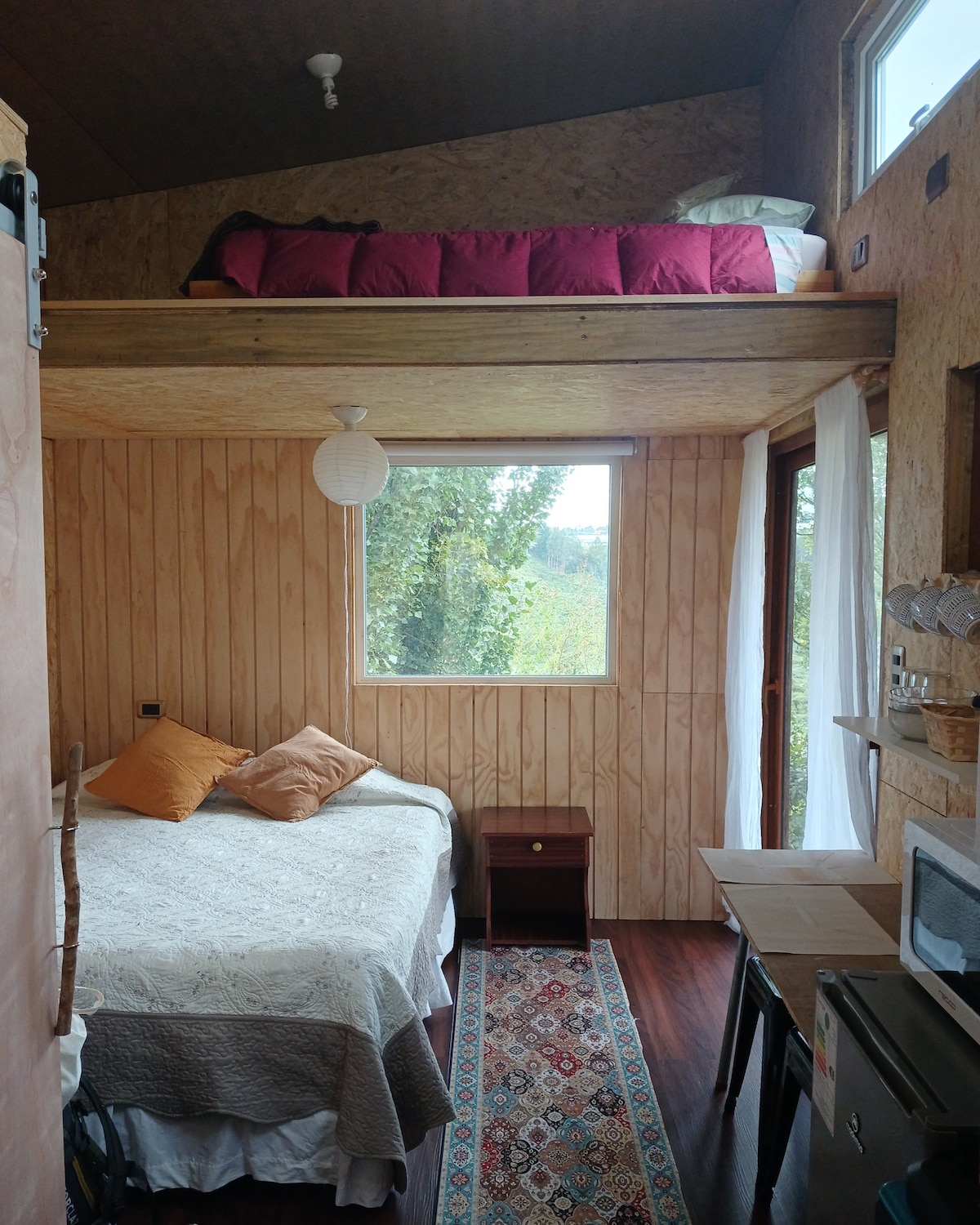 Linda cabana no meio da zona rural de Chiloé. A cabana está localizada especificamente em Teguel Bajo, uma pequena comunidade a 4,5 km da cidade de Dalcahue. É um lugar em meio ao campo, cercado por florestas nativas, a poucos metros do Teguel Wetland e com uma bela vista para o canal Dalcahue. No primeiro andar há amplo espaço onde há cozinha, sala de estar, sala de jantar e tubo quente. No mezanino fica o quarto principal com uma cama de 2 lugares.