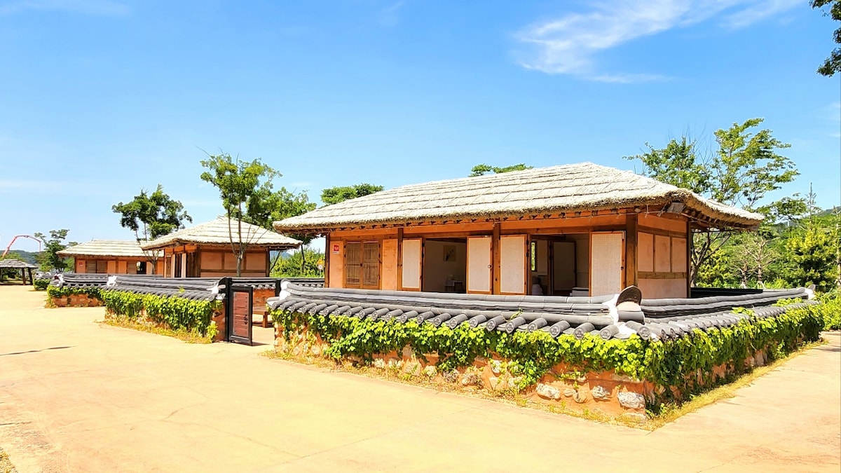 É um hanok privativo com um pátio privativo em um jardim de cura de 20.000 pyeong. É uma casa de telhado de palha que traz de volta memórias da casa da minha avó na minha infância. É uma boa acomodação emocional para umas férias no campo com uma sala de estar com um sofá e uma cama macia, e uma churrasqueira a carvão enquanto observa as estrelas do banco do quintal. Um conjunto de colete e calças da avó está preparado, para que você possa usá-lo confortavelmente e desfrutar de um momento feliz e relaxante com um conjunto de brincadeiras tradicionais.