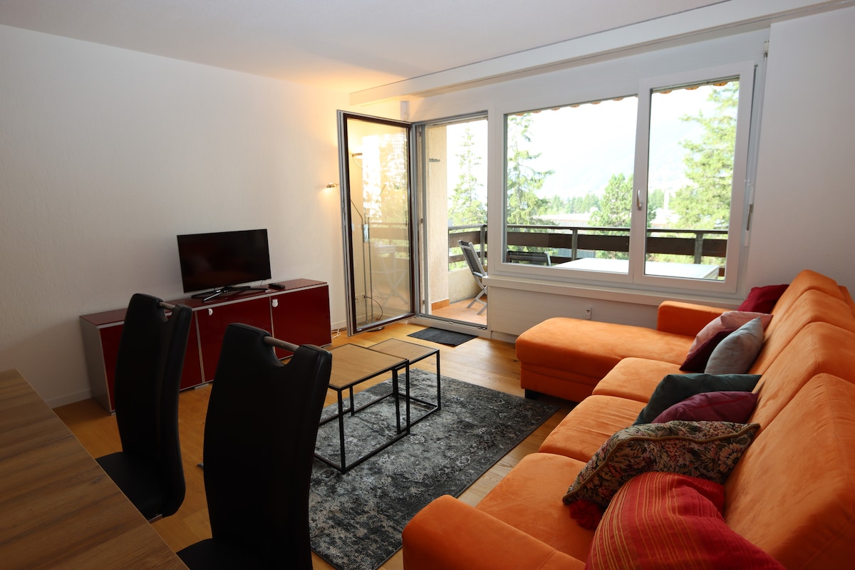 Novo apartamento renovado com 2 quartos, cozinha e 2 vagas de estacionamento ao ar livre. O apartamento está localizado perto do Jakobshorn, onde as pistas de esqui estão localizadas, também adequadas para esqui cross-country. O ponto de ônibus fica a 100 metros da estação ferroviária e do centro. A pé 15 minutos. Quarto com vistas magníficas para a montanha, tranquilamente localizado.