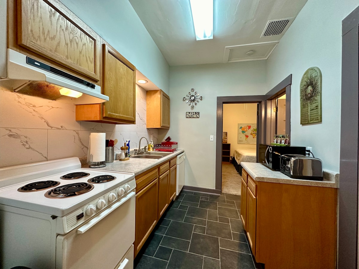 Curta uma experiência elegante neste lugar bem-localizado na praça histórica de Clinton, IL! Unidade no andar de cima com entrada privativa. Entre na sala de estar de conceito aberto e na área da cozinha para encontrar um local aconchegante para relaxar e descontrair. Grandes janelas com vista para o centro da cidade. Pequeno escritório fora da sala de estar é um espaço de trabalho maravilhoso. Quarto privativo na parte de trás com uma nova cama tamanho queen, armário duplo espaçoso e TV inteligente. Internet de alta velocidade, chuveiro separado e banheiro. Seja nosso hóspede!