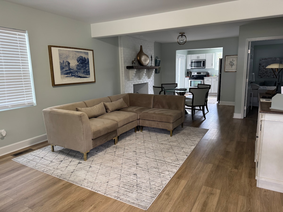 Fuja para um retiro tranquilo e arborizado neste espaço único de 2 quartos/1 banheiro aninhado sob a residência dos anfitriões em Greensboro, Carolina do Norte. Desfrute de uma entrada privativa e de uma varanda coberta com balanço. Ideal para trabalho ou lazer, o espaço possui internet rápida, TV inteligente, cozinha compacta bem equipada, madeira personalizada para uma sensação rústica moderna e um quintal com lareira para noites relaxantes. Este refúgio tranquilo oferece espaço, conforto e privacidade em um bairro residencial tranquilo.