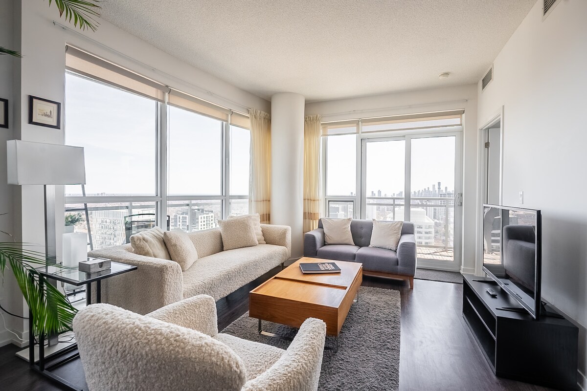 Esta cobertura única no centro de Toronto tem tetos altos de 18 pés e é decorada com móveis de grife e arte. Nenhuma festa ou reunião barulhenta é permitida aqui, eles serão cancelados. Apenas 4 pessoas são permitidas até o total da unidade e são monitoradas por concierge 24h, eles farão check-in em cada hóspede e só permitirão 4 quartos. 3 quartos, um no andar de cima, apenas uma cama 1 cama king e uma cama queen size no andar de cima. O sofá também pode acomodar 1 no topo, mas não é uma cama. Lareira e verdadeira arte de luxo com uma TV de 75"
