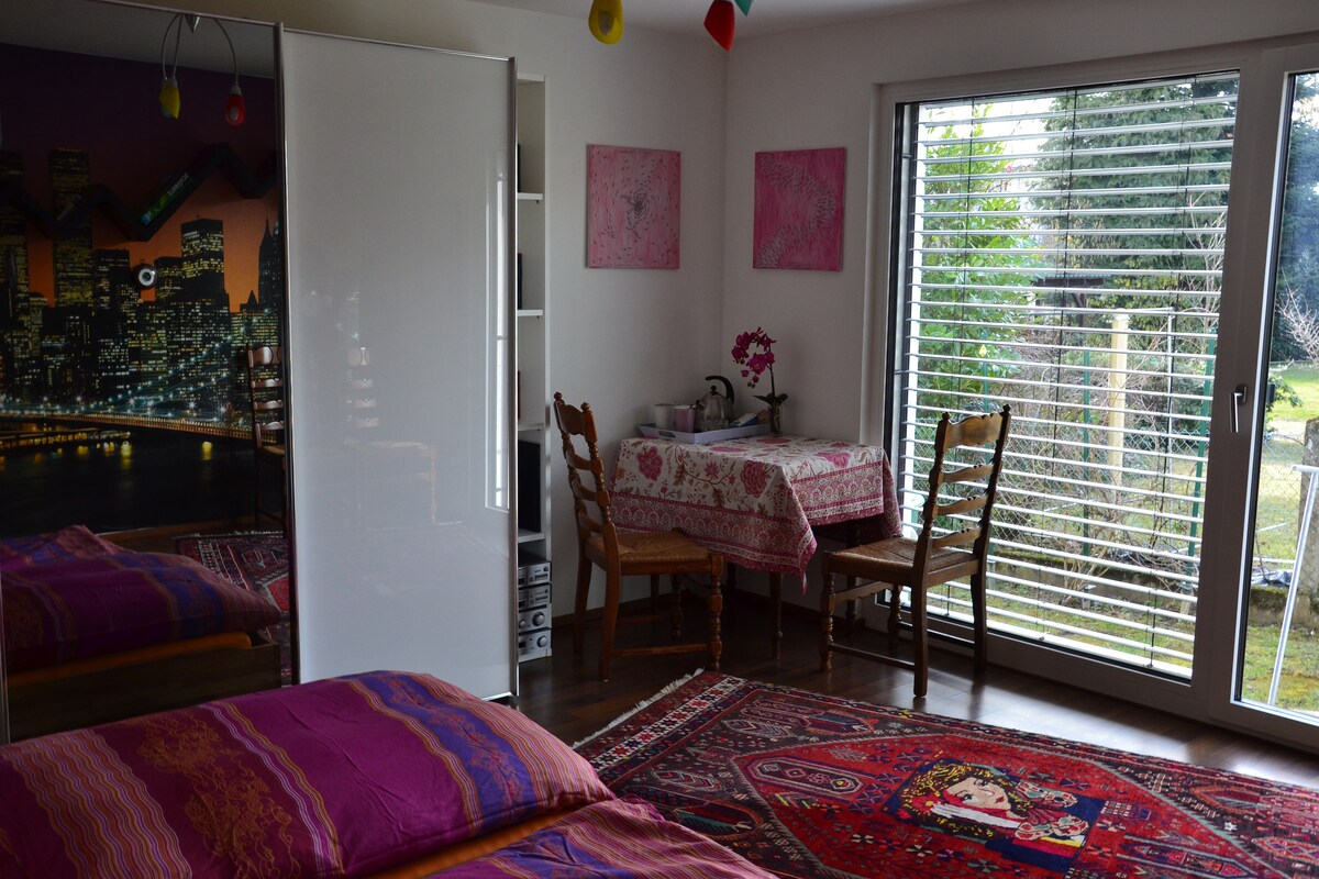 A acomodação oferece um quarto, duas camas, mesa, cadeiras, um armário, bem como uma chaleira, chá e muito mais. O banheiro tem uma pia grande e um chuveiro no nível do chão. Shampoo e toalhas estão disponíveis, é claro. O banheiro, o banheiro e o quarto estão juntos e são uma unidade separada apenas para você. Uma grande janela de vidro com porta de vidro oferece uma vista para o campo. A excelente localização é central, sem trânsito, tranquila, iluminada e verde.