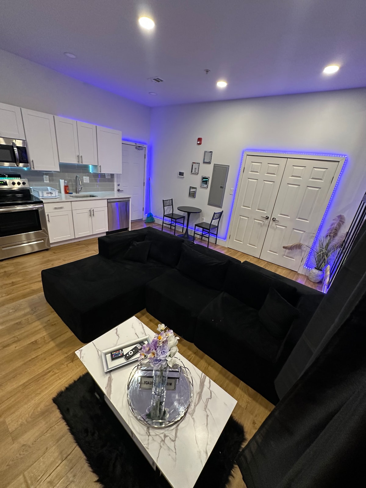Quarto bonito, aconchegante e ensolarado com um sofá seccional em forma de L super confortável. Super limpo e espaçoso totalmente equipado Cozinha com lava-louças, fogão, forno, micro-ondas, cafeteiras regulares e K-Cup, Micro-ondas, Torradeira, Panelas, Panelas, Utensílios e Talheres todos fornecidos. O apartamento inclui (2) TVs de tela plana de 43 polegadas; streaming HULU-Live, Amazon Prime, Disney Plus. Além disso, uma pequena área de trabalho fornece acesso gratuito à lavadora/secadora e estacionamento gratuito (aluguel de curto prazo disponível).