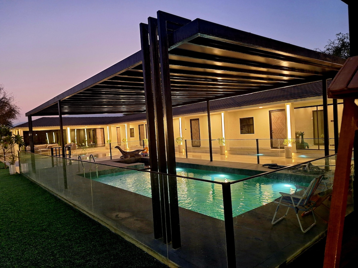 Desfrute de uma estadia tranquila em uma bela casa em uma fazenda privada cercada por árvores e espaços verdes com piscina privativa. O lugar é ideal para famílias e aqueles que procuram relaxar longe da agitação da cidade. A casa está totalmente equipada (3 quartos confortáveis, cozinha, assentos ao ar livre, grelha). Perto de serviços e estradas principais, é uma viagem fácil de Dubai, oferece uma excelente vista da natureza. Uma autêntica experiência rural com luxo e conforto no meio do deserto