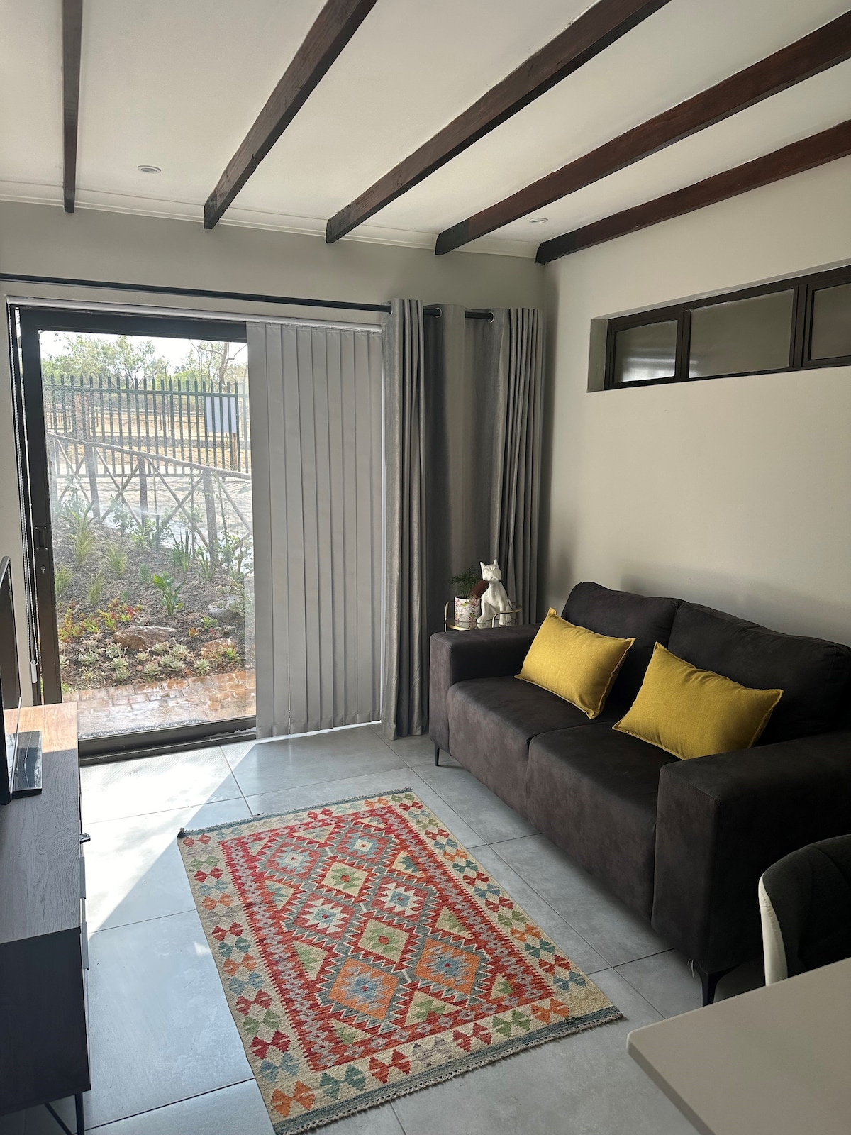 Este apartamento cheio de luz é totalmente privado, com sua própria entrada, separado da casa principal - perfeito para paz e tranquilidade. No interior, você encontrará um quarto aconchegante com banheiro privativo, além de uma espaçosa área de estar com espaço para refeições e uma cozinha compacta para sua conveniência. O apartamento é alimentado por eletricidade solar de reserva e um gêiser solar, para que você possa desfrutar de uma estadia confortável sem o incômodo de redução de carga. Compartilhamos nossa casa com dois cães e um gato — animais de estimação que adoram pessoas