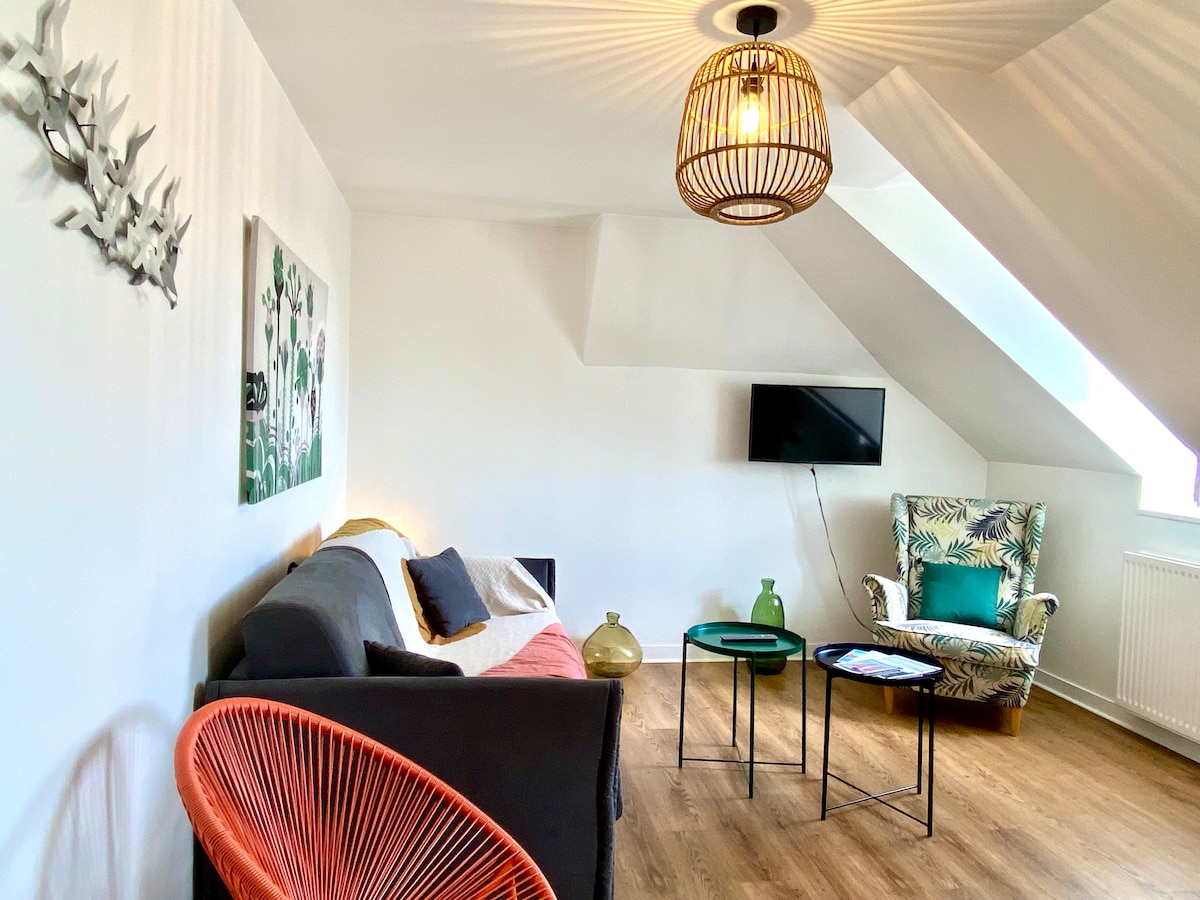 Apartamento muito bonito, com um pequeno terraço, grande entrada que dá para uma cozinha equipada (forno, geladeira, máquina de lavar louça, chaleira, cafeteira, torradeira, microondas, fogão vitrocerâmico...) e sala de estar com sofá e televisão. Talheres e utensílios de cozinha fornecidos. O quarto tem uma cama king-size de 180 cm, um espaço para tomar banho e uma banheira grande. A limpeza está incluída, portanto, gratuita, a cama está feita. Um suplemento de 10 €/estadia se aplicará se houver um animal de estimação