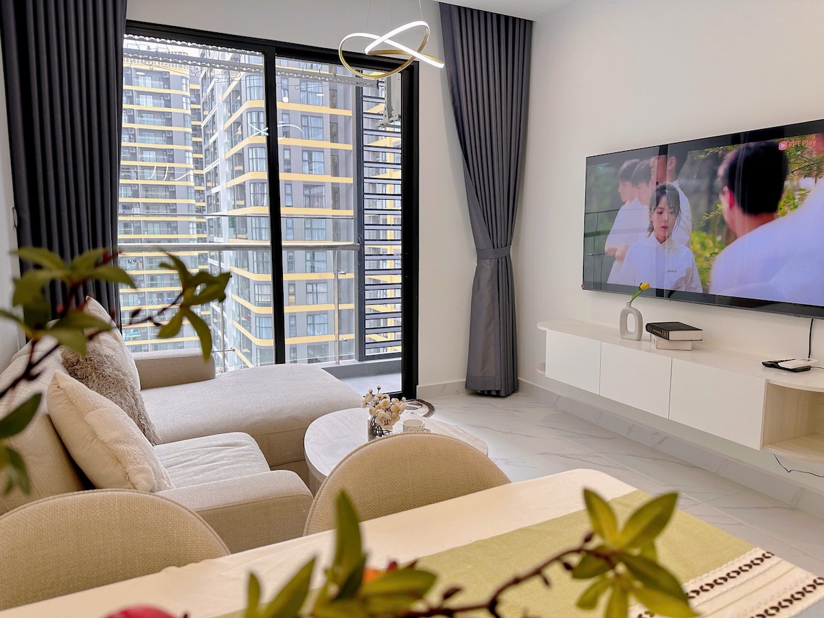 Meu apartamento é do projeto de apartamentos The Rivana no meio da aula de luxo. O endereço é 60/3 Binh Duong Avenue, Vinh Phu Ward, Thuan An City, Binh Duong Province. Este é um apartamento novo e cheio de equipamentos. Temos: 02 quartos, 02 banheiros, 01 mesa de jantar grande para 06 pessoas, 01 grande varanda com vista para o Rio Saigon. Você pode usar cheio de serviços aqui, incluindo sala de ginástica, sala de esportes, ioga, etc. Isso é bastante calmo, fresco e fácil de viajar.