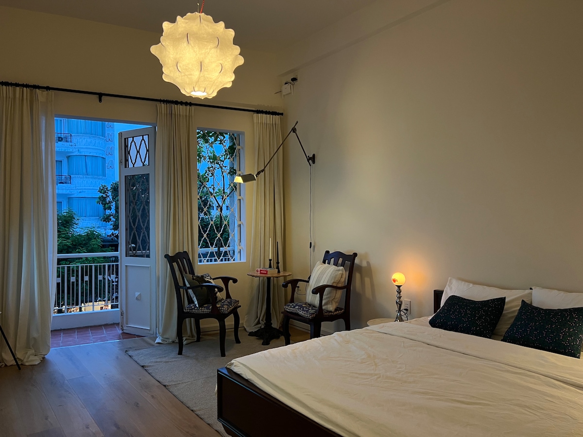 A 24m² Old Saigon balcony loft tucked inside a charming residential building in Central District 1 (2nd floor, stairs only). Set inside a former Saigon residence later adapted into a residential building, the architecture still reflects its original character and layout. The studio blends modern comfort with subtle classic details — warm lighting, wooden flooring, soft curtains, and vintage armchairs that create a calm atmosphere in the middle of the city.
