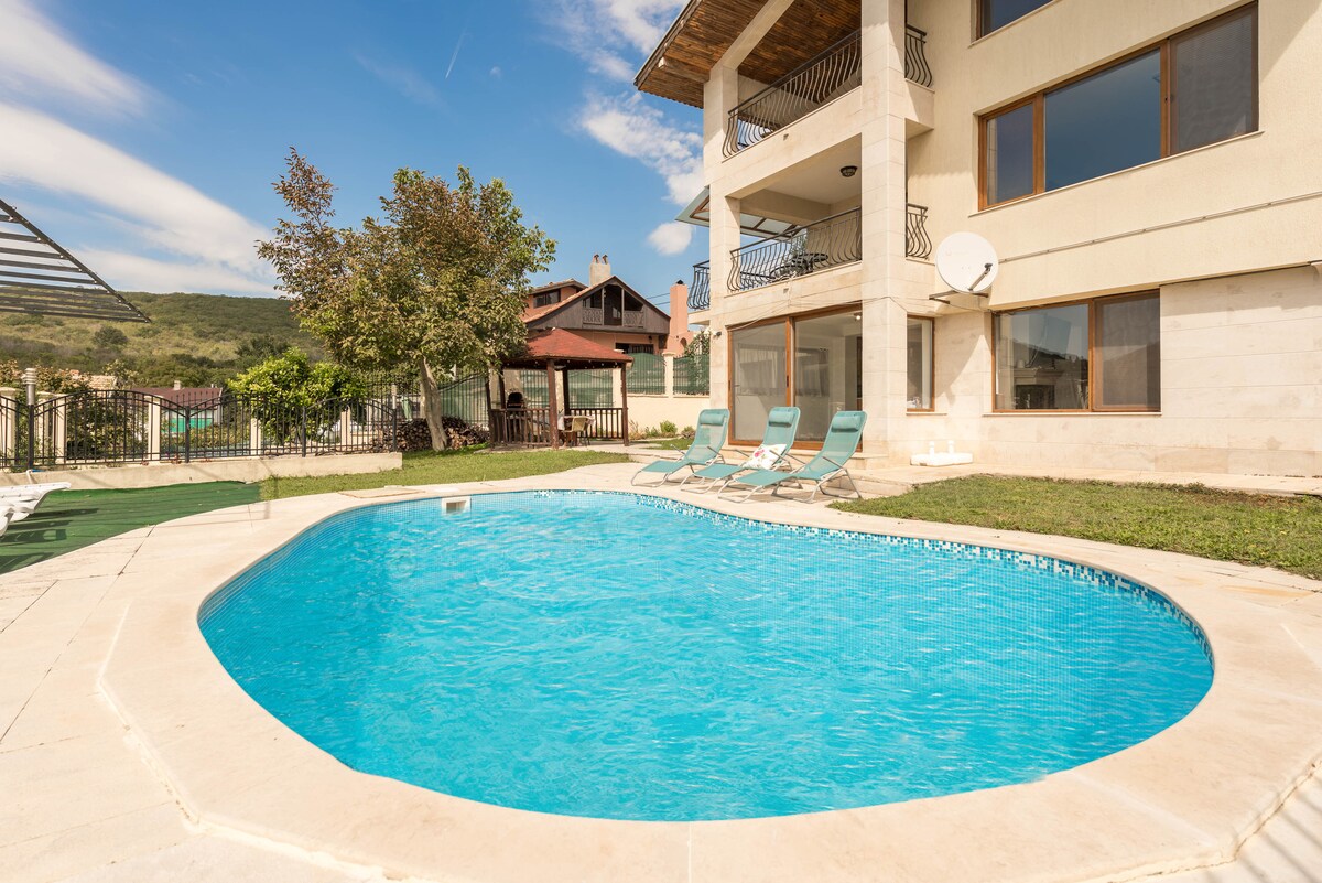 Refúgio no mar na Villa Popi - Balchik Villa Zone - A vila oferece 3 quartos, 3 banheiros, uma sala de estar com uma cozinha totalmente equipada; ar condicionado em cada quarto; uma área de relaxamento e entretenimento com uma mesa de bilhar; Jardim geminado com uma piscina privativa, espreguiçadeiras e churrasqueira. Os terraços revelam uma vista deslumbrante para o mar e para a baía; 2 vagas de estacionamento disponíveis. Balchik, com suas atrações e praia, fica a apenas 6 km da vila, enquanto Albena fica a 10 km de distância.