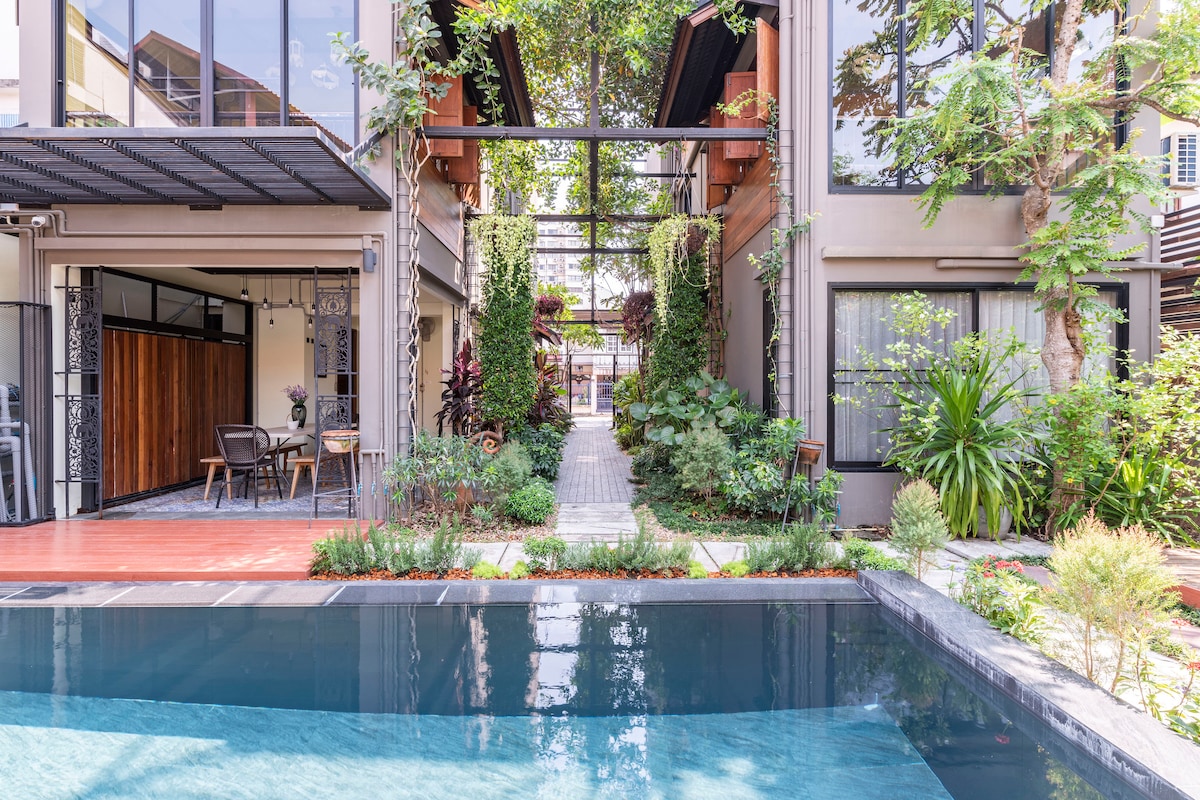 Descanse e relaxe no seu oásis estilo resort. Seu grupo estará a poucos minutos das atrações de Chiang Mai e a poucos passos de dezenas de restaurantes e lojas locais! Algumas coisas que você vai adorar: Piscina estilo★ resort, 2 cabanas elegantes, (compartilhadas e espaçosas), campo de golfe, mesa de bilhar de 7 pés ★Excelente localização. Caminhe até restaurantes e lojas locais. 5 minutos de carro até Meechok. Chegue à Cidade Antiga ou Nimman em 15 a 20 minutos ★Fantástica sala de estar, cozinha e sala de jantar em conceito aberto; Grande pátio privativo ★Limpeza profissional