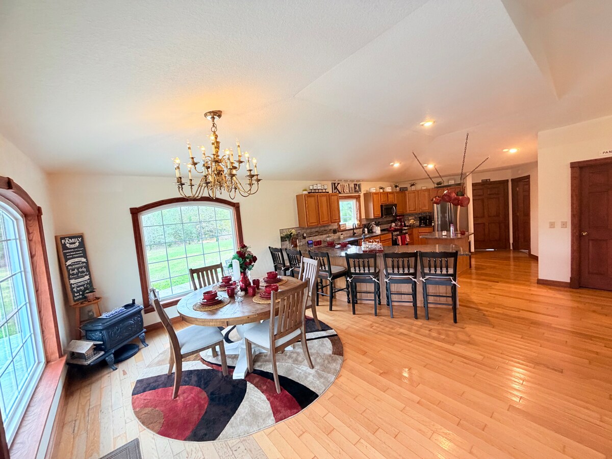 -Perfeito para várias famílias, festas de casamento ou grupos de trabalho e hóspedes que vêm para a Copa do Mundo da KC - Cozinha bem abastecida, mesa de jantar para 8 + mesa infantil para grandes refeições - Pátio e fogueira NOVOS -31 min para o aeroporto de KC; 24 min para Weston; 10–26 min para St. Joe; 27 min para Atchison; 35 min para Leavenworth - Adequado para crianças com sala de brinquedos, filmes e livros infantis, cercadinho e cadeirão - Belas vistas em um ambiente tranquilo e pacífico -Reabrir no verão após a ocupação do proprietário durante a construção da casa