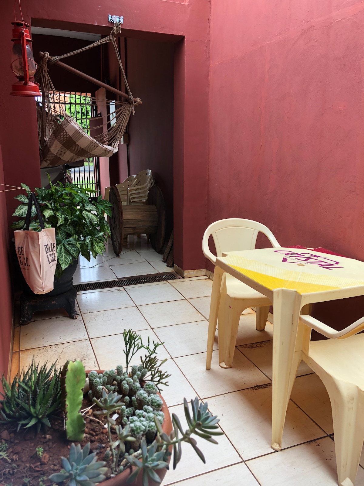 O espaço conta com um quarto com cama de casal kingsize com ar condicionado, quarto/ sala com duas camas de solteiro, um sofá cama muitíssimo confortável e um colchão de solteiro, também com ar condicionado, cozinha e banheiro. A Casa é fresca, ampla, segura e bem localizada.
