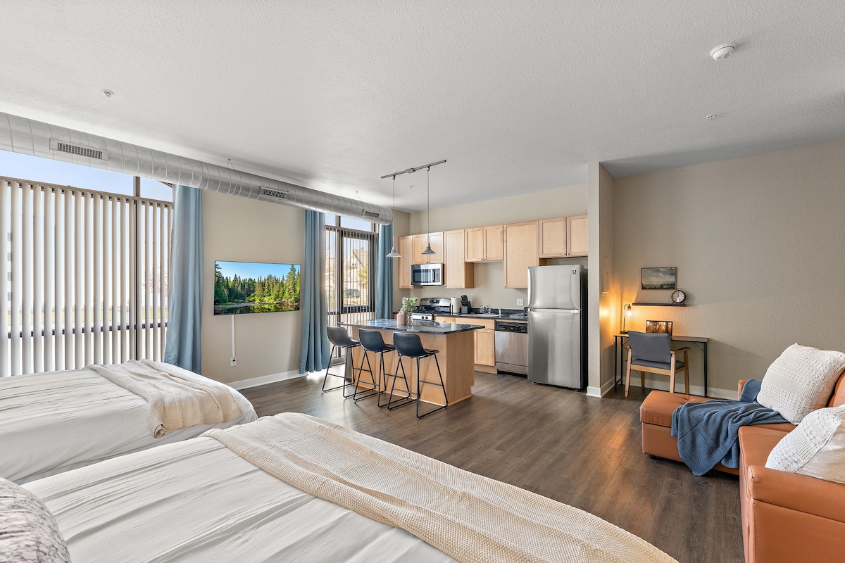 Entre em um verdadeiro refúgio urbano que foi totalmente renovado, oferecendo 93 metros quadrados de espaço inspirador. A cozinha europeia moderna aguarda suas aventuras culinárias, enquanto a sala de estar serena, adornada com uma grande lareira e TV de 75", convida ao relaxamento. Flua perfeitamente para o quarto arejado, com uma cama king-size e um espaço de trabalho exclusivo. O banheiro, com seus azulejos do chão ao teto e luxuoso chuveiro de efeito chuva, exala elegância. Para conforto, esta unidade é totalmente climatizada e aquecida.