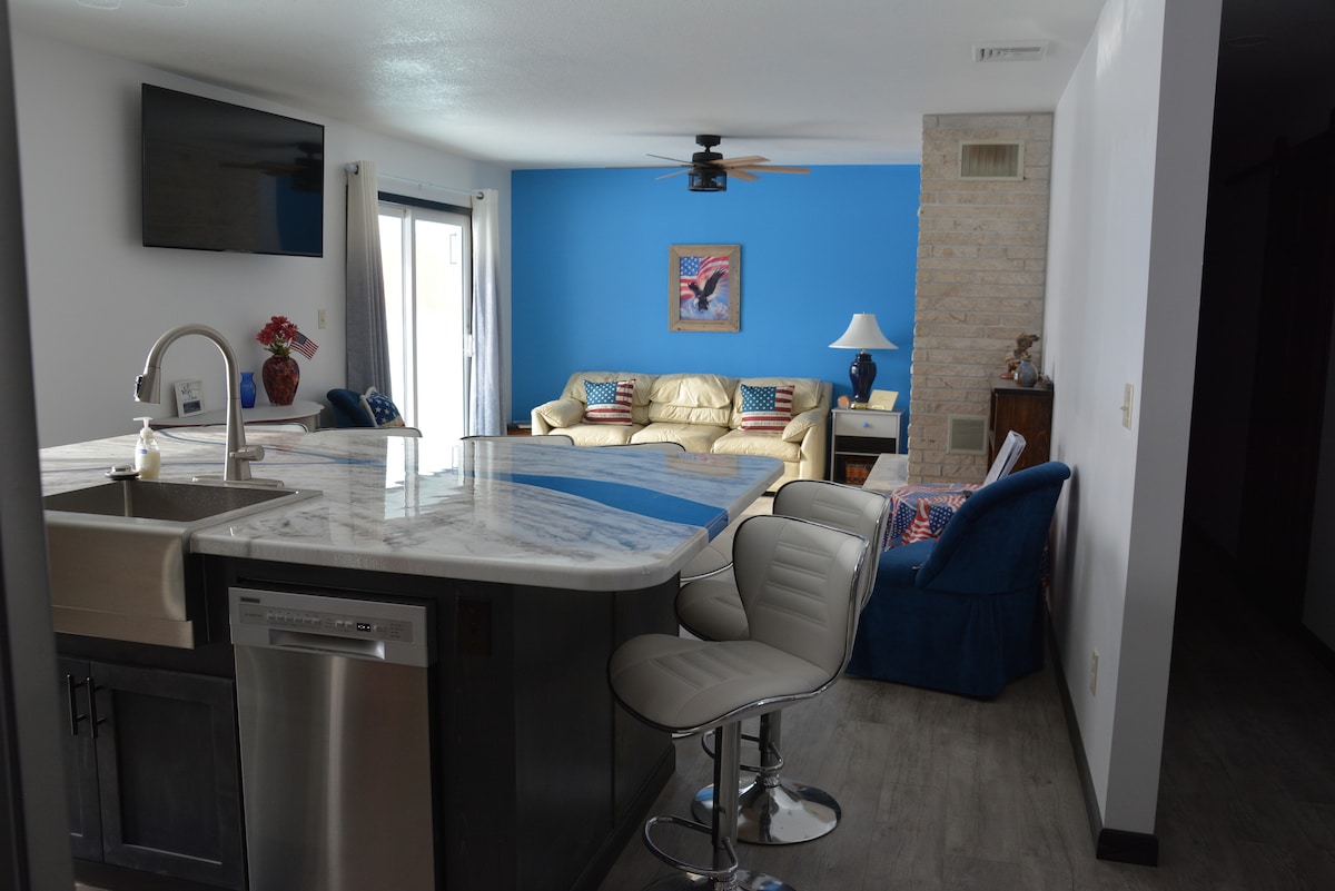 A Suíte Oeste do Bunkhouse acomoda 6 pessoas: 2 quartos e 1 Murphy com camas queen de espuma de memória, baú, mesas de cabeceira, ventiladores de teto. 1 banheiro com chuveiro personalizado, pia de vaso. 1 cozinha com cooktop de indução, geladeira/freezer, pia dupla. 1 sala de estar com uma tela grande, sofá reclinável e cadeira. 1 sala de jantar com mesa, assentos para 6 pessoas. 1 balcão de café da manhã para 3 com uma tela grande. 1 Lavanderia compartilhada com máquina de lavar e secar roupa e pia grande. 1 quintal compartilhado com churrasqueira.
