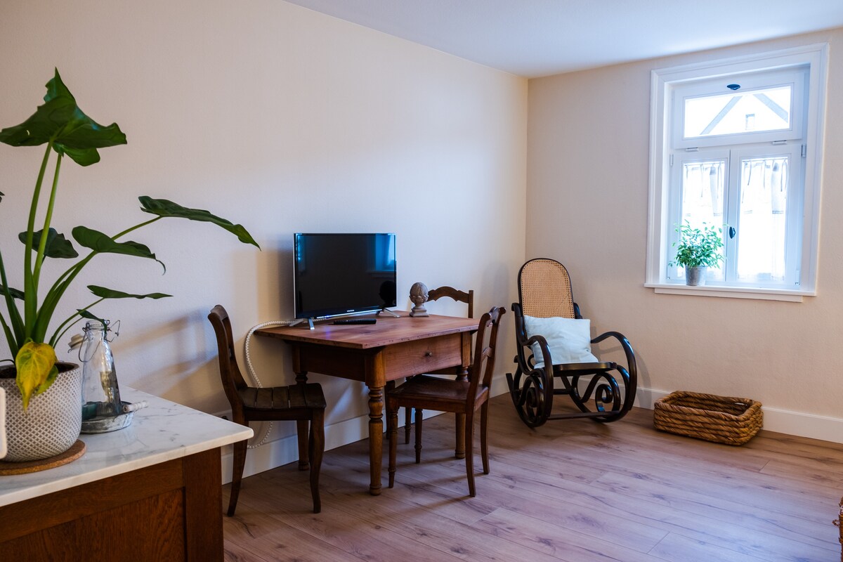 Cozinha, quarto, banheiro. Todos os quartos com luz natural e completamente reformados recentemente. O apartamento fica no porão, mas é iluminado e quente. O sol da manhã está brilhando diretamente no quarto. À noite, o sol visita a área de jantar ao ar livre e convida você a relaxar. Cores orgânicas e cortiça oleada, eletricidade fotovoltaica própria, carpete de lã e detalhes cuidadosamente selecionados garantem o bem-estar. Vida familiar na casa. Entrada própria, estacionamento e área de jantar ao ar livre. No meio da bela natureza.