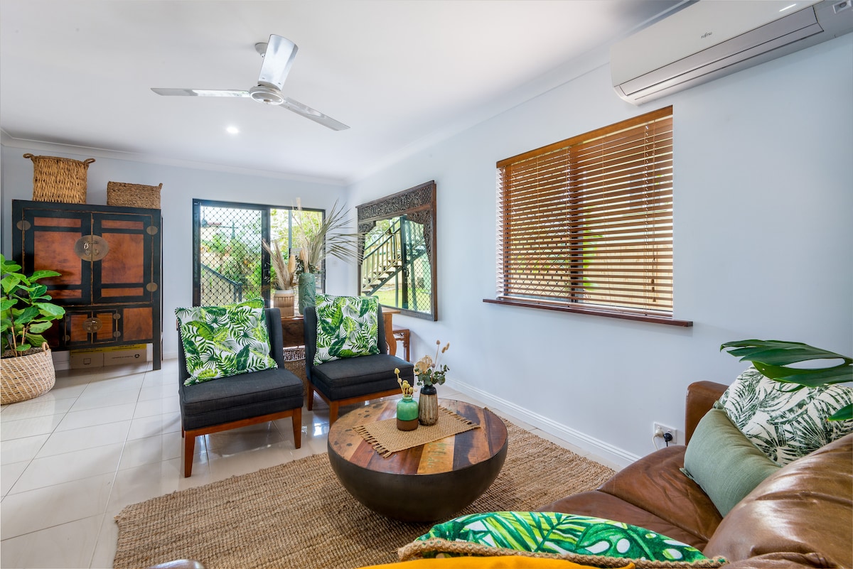 Damos as boas-vindas a todas as nacionalidades do exterior e localmente à nossa unidade de um quarto totalmente mobiliada que foi adicionada à nossa casa de família existente. Você tem sua própria entrada, quarto, cozinha, banheiro e sala de estar com sofá que se converte em uma cama de casal. Estamos situados em uma rua sem saída familiar e tranquila com estacionamento gratuito no local. Estamos a aproximadamente 14 minutos de carro do Aeroporto de Cairns ou do Centro da Cidade de Cairns, portanto, recomendamos o seu próprio carro.