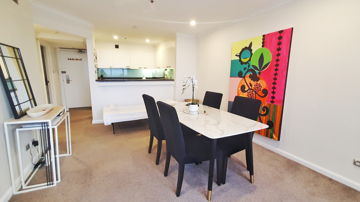 Bem-vindo ao nosso apartamento renovado de 2 quartos com estacionamento, com móveis modernos e luz natural abundante. A cozinha totalmente equipada permite que você prepare refeições deliciosas. Táxis macios adornam todos os móveis e os materiais do quarto são renovados para cada hóspede. 3 minutos a pé de Westfield e 7 minutos a pé da Estação Ferroviária, você pode chegar a Sydney CBD em 20 minutos. Ideal para estadias, estadias de trabalho em casa ou estadias em família. Por favor, observe que os móveis podem variar de acordo com as fotos. Aproveite sua estadia!