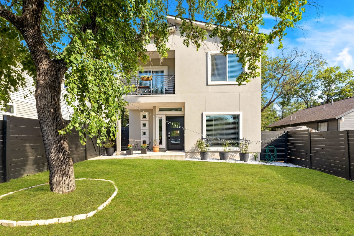 Esta casa espaçosa com uma vibração calma e pitoresca é o lugar perfeito para sua família ou grupo se reunir. Relaxe neste espaço elegante e sereno. A 8 minutos de carro do centro da cidade e a 5 minutos da East 6th Street. Perto de destaques de Austin como o mural "You 're my butter half", cafés como Benu, Juiceland, food trucks de tacos e restaurantes. Confortável, com toques de vibração neutra. Local aconchegante perfeito para relaxar depois de um dia em Austin. Trabalhando enquanto viaja? Nossa velocidade WiFi é consistentemente 375mbps para cima e para baixo.