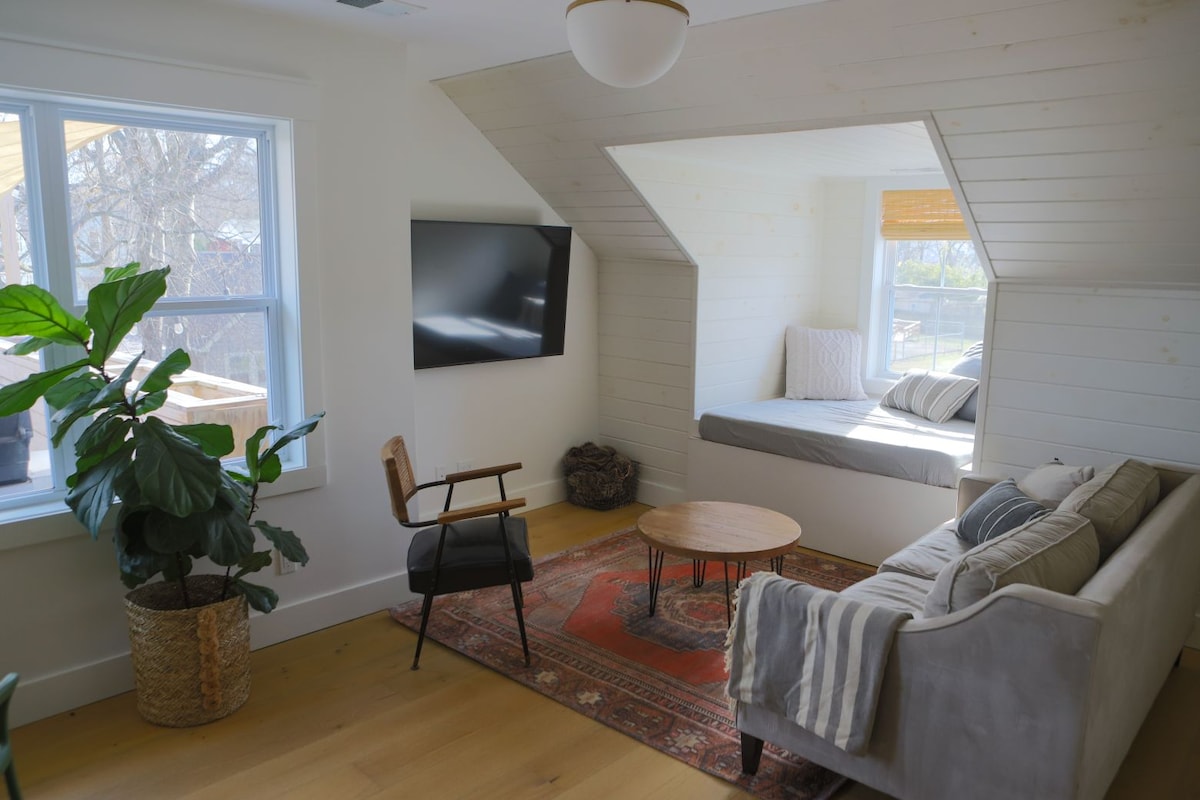 Concluímos recentemente a renovação da nossa casa, que inclui uma suíte de hóspedes de um quarto bonita e aconchegante. Os hóspedes terão acesso à sua própria entrada privativa através do seu próprio deck de 16 x 24 pés. A suíte inclui um quarto com cortinas blackout, uma máquina de som, banheiro com uma combinação de banheira/chuveiro, cozinha acoplada (geladeira de tamanho completo, pia, máquina de lavar louça, queimadores de indução, forno de torradeira, micro-ondas), mesa de jantar e uma sala de estar com um sofá, recanto de leitura e TV.