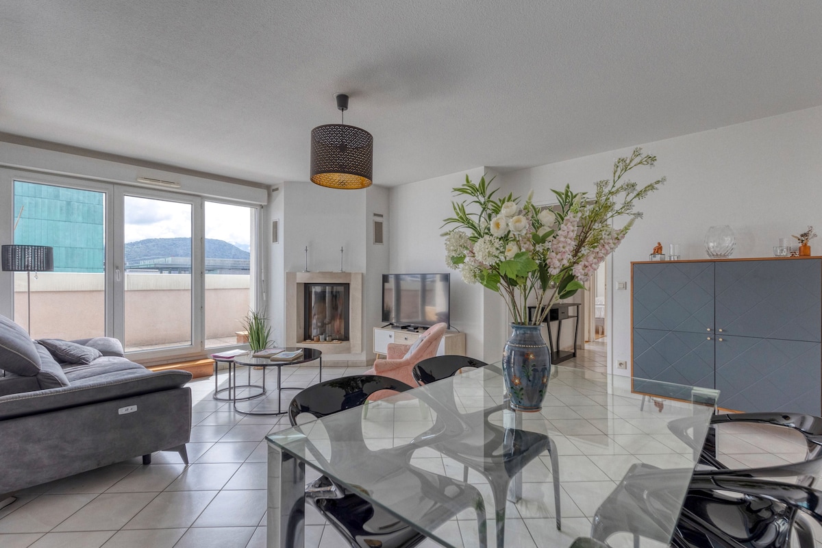 Totalmente reformado, tranquilo e elegante, este estúdio banhado por luz oferece uma vista deslumbrante para as montanhas. Desfrute de um espaço perfeitamente equipado, incluindo uma área de dormir na sala de estar, uma cozinha com louça e utensílios, um banheiro com chuveiro/vaso sanitário e armários inteligentes. A TV está à sua disposição. Ideal para uma viagem de negócios ou para descobrir Grenoble e seus arredores Reserve agora para uma experiência única!