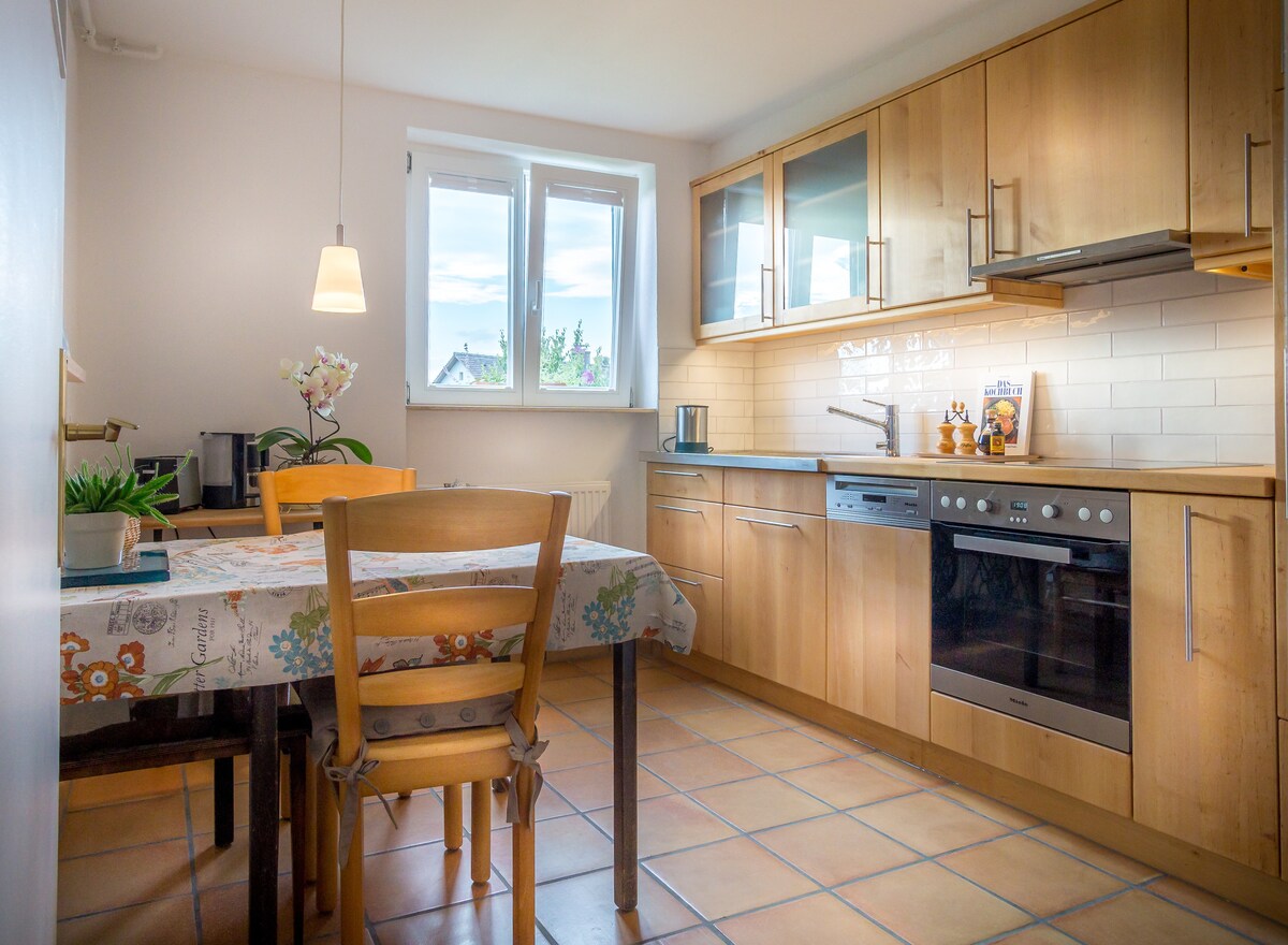 Apartamento de 1 quarto de bom gosto, tranquilo e central (3 min - caminhada na cidade) com situação panorâmica. Vistas da Floresta Negra, dos Vosges na Alsácia/França, das ruínas da Cidade Velha e do Castelo de Staufen. Térreo com acesso ao terraço a partir da casa isolada. Estacionamento na rua em frente à casa.