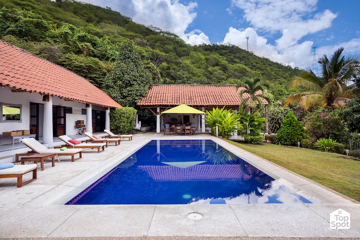 Aproveite o melhor clima em Anapoima ☀️ Relaxe em uma casa moderna com piscina privativa e jacuzzi, cercada pela natureza. Ideal para viagens em família. Fica em condomínio seguro a apenas 3 km da aldeia, com vigilância 24 horas. Fácil 🚗 acesso e estacionamento em frente à casa. Faça uma caminhada, um passeio de bicicleta ou relaxe na jacuzzi aquecida. 🏡 Com Wi-Fi para sua conveniência. Você vai adorar! Reserve e viva uma viagem inesquecível.