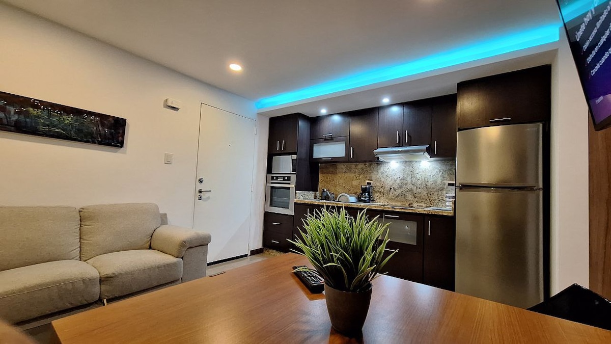 Cocina equipada con tope de granito. Ubicación inmejorable: cerca de comercios, supermercados, bancos, spa, gimnasio, canchas de padel, entre otros. Moderna suite para su estadía en Caracas, relativamente cerca del pueblo de El Hatillo, Centros médicos, bancos, haciendo la vida cómoda y práctica. Seguridad las 24horas y la ubicación es estratégica.