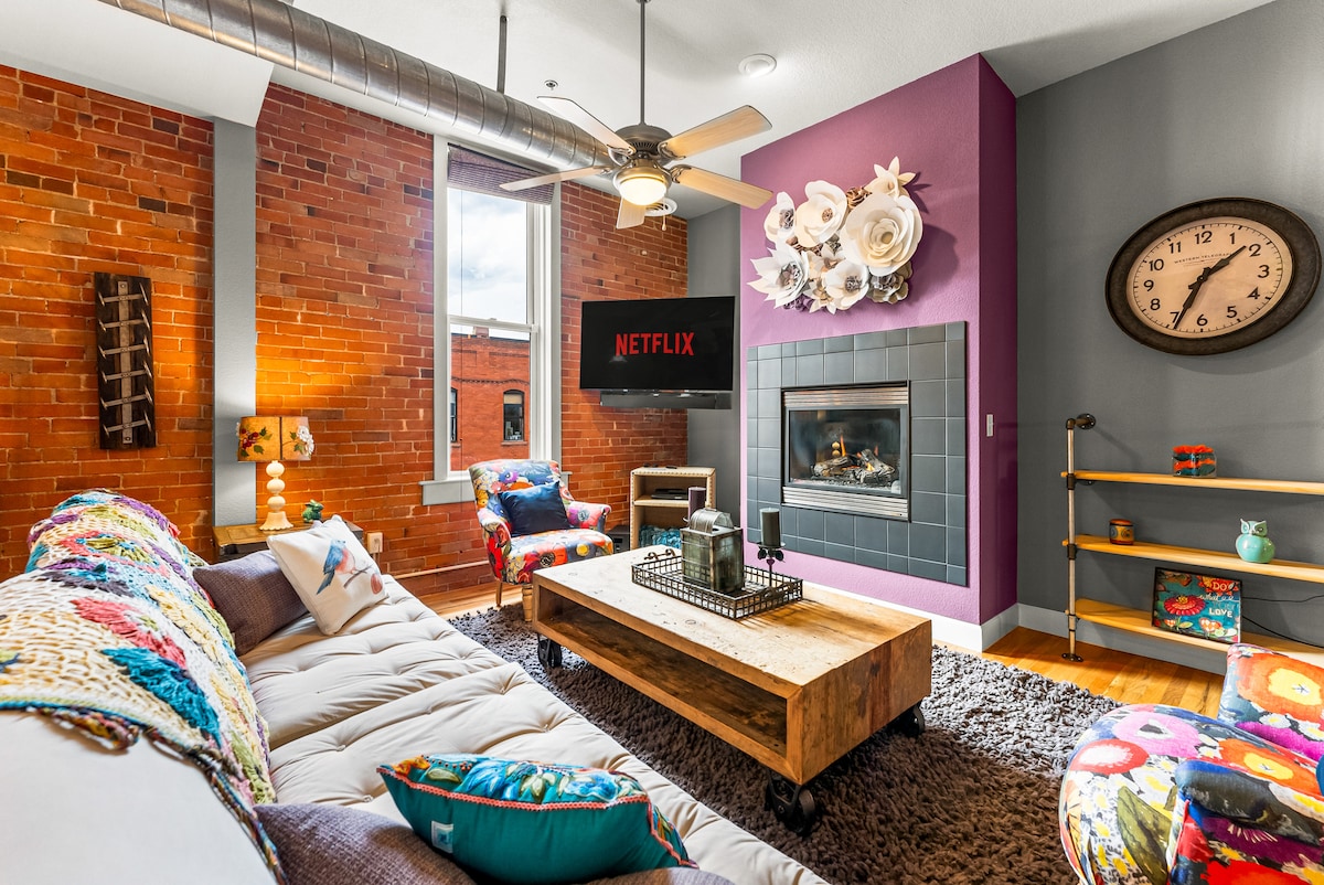 Desfrute do verdadeiro loft que vive neste edifício histórico centenário. Localizado no coração da Cidade Velha do Colorado, este elegante e grande loft de estúdio é o seu retiro perfeito enquanto você explora Colorado e Manitou Springs. Paredes de tijolos, pisos de madeira, tetos altos, vitrais personalizados e vista para a varanda de Pikes Peak. Restaurantes, lojas e pubs de cerveja estão a uma curta distância da sua porta da frente. A poucos minutos do Jardim dos Deuses. Unidade DO 3º andar sem elevador - 52 degraus até o terceiro andar