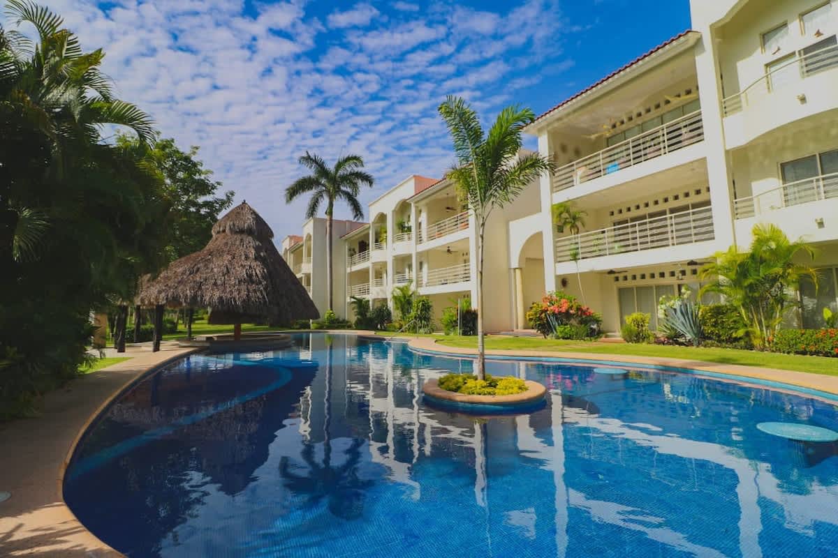 Refúgio perfeito em Nuevo Vallarta Dentro, você vai gostar de: ° Dois quartos espaçosos com camas confortáveis e muito espaço de armazenamento ° Ar condicionado completo ° Cozinha equipada perfeita para cozinhar ou estadias mais longas ° Varanda privativa com vistas deslumbrantes ° Várias piscinas para se refrescar ° Jacuzzi para relaxar ° Academia moderna para se manter ativo ° Fácil acesso à praia nas proximidades ° Vistas do campo de golfe intocado/Marina ° Estacionamento gratuito Sua estadia perfeita na costa espera por você!!