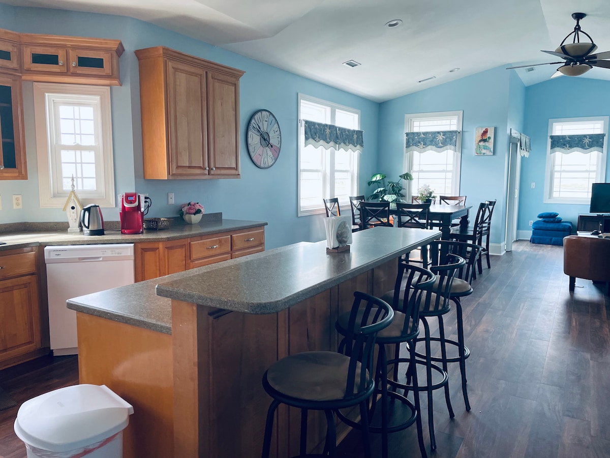 Acorde no paraíso neste belo duplex com inúmeras varandas para desfrutar do pôr do sol e do nascer do sol com vista para o pântano. A propriedade está a uma curta distância a pé da praia. Chuveiro ao ar livre para se enxaguar após um dia de praia. Nossa cozinha está totalmente abastecida para sua conveniência. Também fornecemos algumas cadeiras de praia, brinquedos/jogos de praia, 3 bicicletas e 2 pranchas de remo com um ponto de lançamento na estrada. Animais de estimação são permitidos, consulte as regras da casa para saber mais.