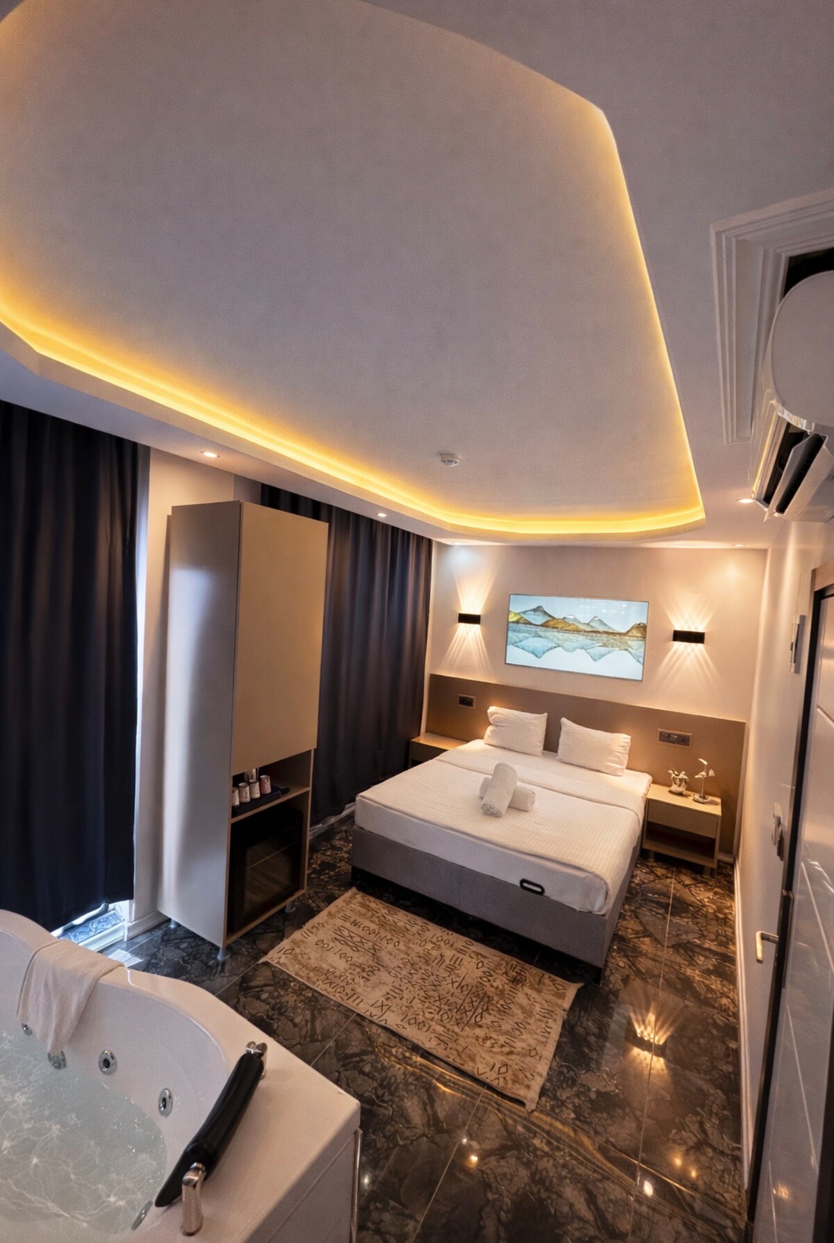 Este estúdio espaçoso oferece uma cama de casal e uma espaçosa área de estar. A área de estar tem um sofá grande que pode ser usado como uma cama para o hóspede adicional. O estúdio oferece uma kitchenette privativa e um banheiro privativo com jacuzzi de tamanho médio (140 cm *80 cm). Há 24 horas de porta e uma vez a cada 2 dias de serviço de quarto. O banho turco precisa ser reservado no momento da chegada para entrada gratuita. Além disso, meus hóspedes terão %10 de desconto no restaurante,por favor, mencione que você é hóspede do Yusuf:)