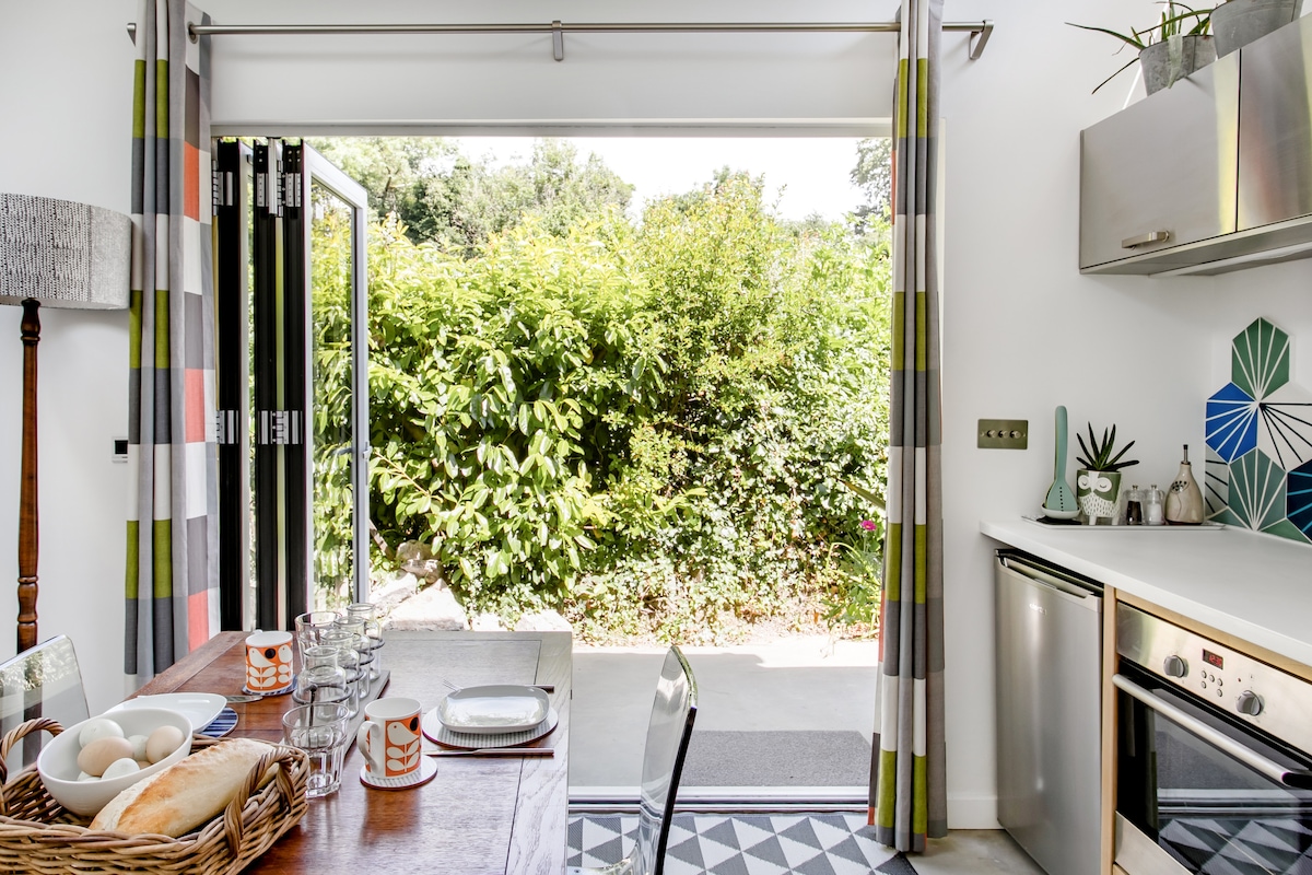 O Galpão de Vasos é um espaço leve e acolhedor, inteligente e bem projetado, com uma cama de luxo para descansar depois de um dia caminhando na charneca ou na praia. Um refúgio tranquilo e privado, que é acessível, com aquecimento sob o piso, fogão a lenha e claraboias. Abra 2 conjuntos de portas duplas para deixar as brisas frescas do campo circular. Passeie até um jardim de dois andares para um local de sol. Há muitos espaços para relaxar por dentro e por fora, com pátios laterais e traseiros, um jardim traseiro e o palácio de morcegos artesanal para se sentar em qualquer clima ou hora da noite com uma fogueira. O Galpão de Vasos e o edifício do estúdio em nosso jardim nos limites do Parque Nacional na cidade única de Ashburton. O Galpão de Vasos tem vista para a floresta Place e é um espaço ecológico isolado projetado e construído por nós com aquecimento sob o piso controlado termostaticamente, alimentado por uma bomba de calor de fonte de ar e fogão a lenha Morso. No verão, abra ambas as portas dobráveis para experimentar o canto dos pássaros e apreciar a bela tela verde das árvores à sua frente. Criamos um espaço leve e acolhedor com clássicos de design e cama de luxo para descansar depois de um dia caminhando no charneca ou na praia. Há muitos espaços para relaxar por dentro e por fora, com espaços de pátio ao lado e na parte traseira da propriedade, um jardim dos fundos e atrás do palácio de morcegos artesanal. Escolha o seu tempo e o seu lugar para relaxar e desfrutar do churrasco/fogueira. Há muito estacionamento na pista, no entanto, há um espaço de estacionamento dedicado para os hóspedes na propriedade. Estamos perto de uma escola local que também administra um centro esportivo (Ashmoor Centre), onde os hóspedes podem reservar quadras de tênis, participar de aulas de exercícios e uma academia após as 15h30 nos períodos de aula e o dia todo nos fins de semana e durante as férias escolares. Pode haver algum ruído ambiente à distância da escola durante o período letivo.