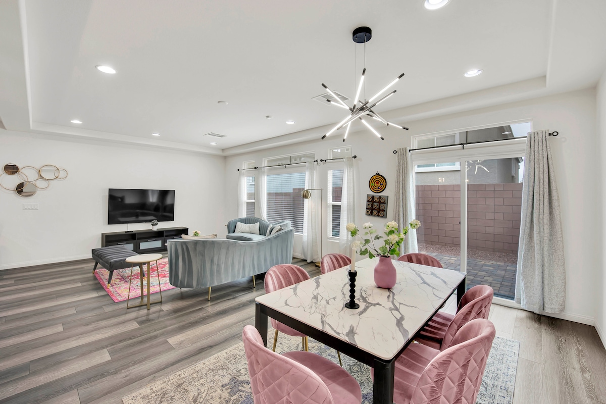 LOCALIZAÇÃO❗️LOCALIZAÇÃO❗️LOCALIZAÇÃO ❗️Nossa linda casa de designer é novinha com todos os móveis novos, o que é realmente uma joia para você em 30 anos ou famílias ou pessoas de negócios em todo o mundo se reunirem ou trabalharem!! ❤️❤️ Estamos convenientemente localizados em uma bela área recém-construída bem perto do Walmart, Sams, Albertson, Sprouts e muitas lojas e restaurantes de chá/café/boba; 8 minutos - letreiro de boas-vindas/Mandalay Bay/Town Square/MGM 10 minutos - Strip/Aeroporto/Estádio Raider 🏟 15 minutos - UNLV/Centro de Convenções/Chinatown🔥
