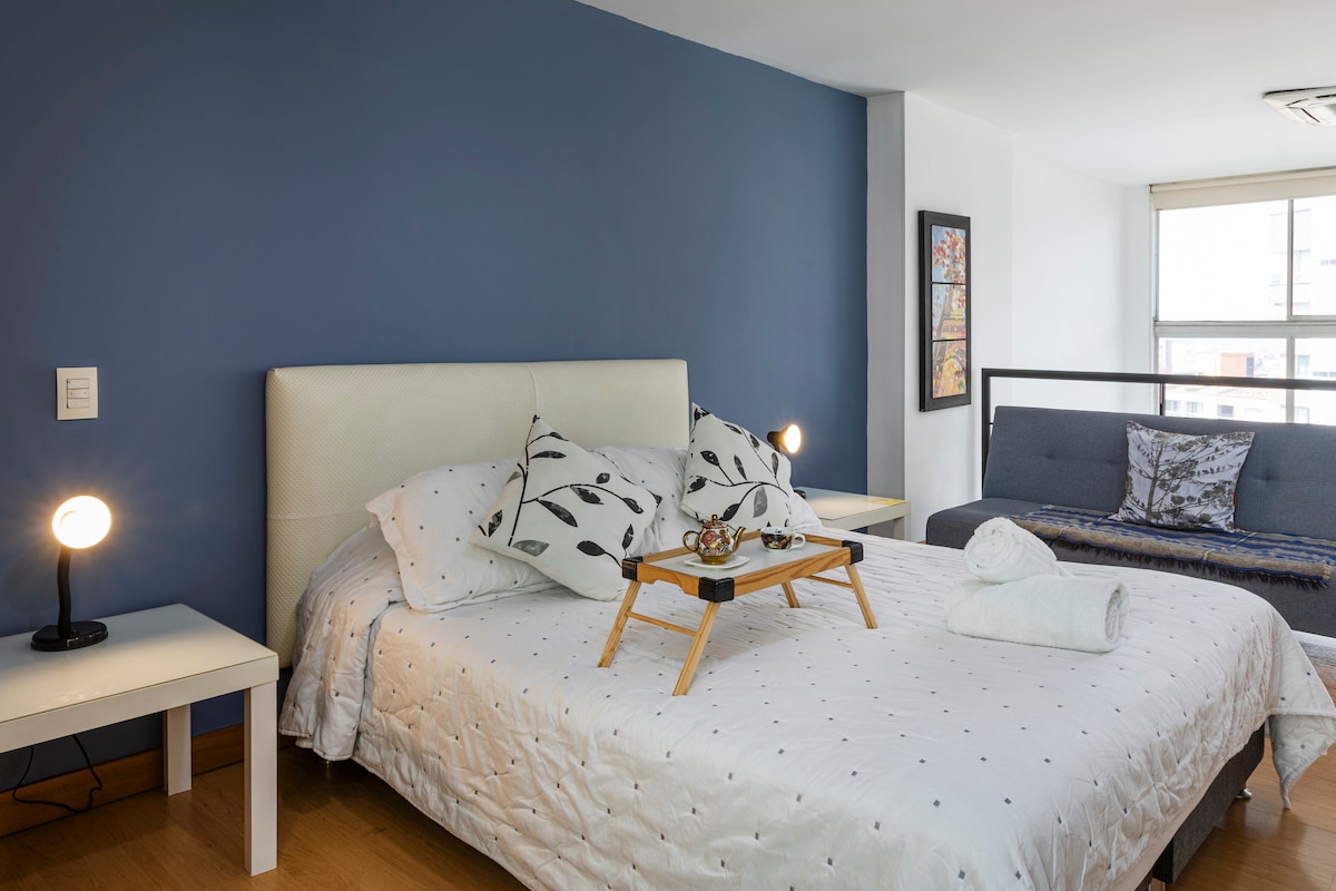 Reserve uma experiência elegante neste estúdio exclusivo de plano aberto perto do parque Lleras! - INCLUÍDO NESTE ESPAÇO - - Espaço de trabalho exclusivo com Wi-Fi de alta velocidade - Jacuzzi privada - Ar-condicionado - Estacionamento no local - Smart TV rotativa de 54" - Netflix - Cama king size de qualidade de hotel - Máquina de lavar/secar no local - Cozinha totalmente funcional - Estação de chá/café - Cortinas black-out - Sabonete para o corpo, xampu e condicionador - Academia - Sauna - Piscina - Bares, restaurantes e cafeteria no local - Galeria de arte