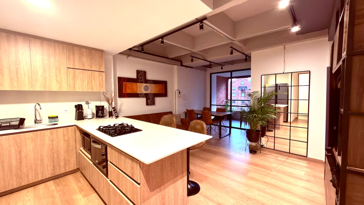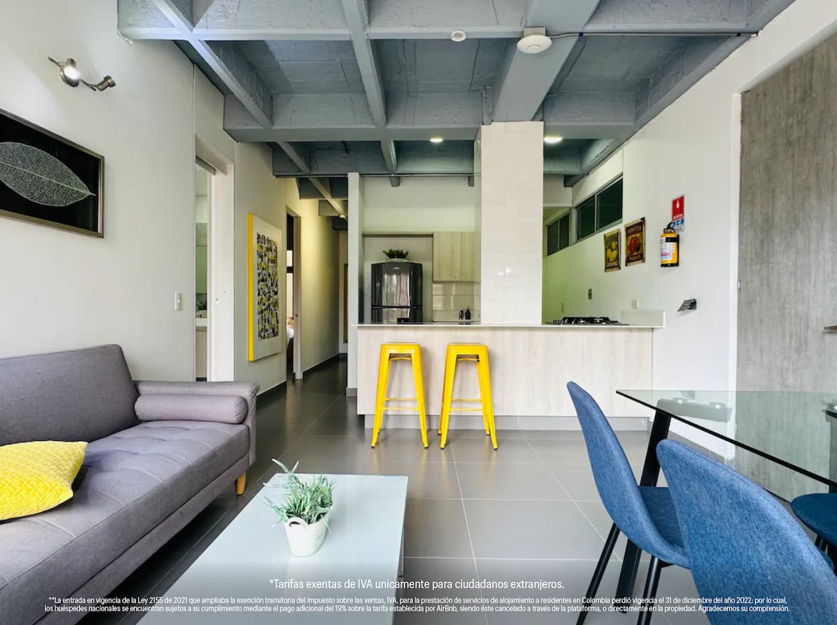 Amplos espaços, varanda, sala de jantar, cozinha, dois quartos, cada um com cama de casal, boa ventilação e iluminação, um banheiro espaçoso, tudo com um toque aconchegante, que fará você se sentir em casa. A localização é estratégica, você estará a 8 minutos a pé da estação de metrô Envigado e do shopping Viva, a 10 minutos de transporte público do povoado e a 15 minutos de metrô do centro de Medellín.
