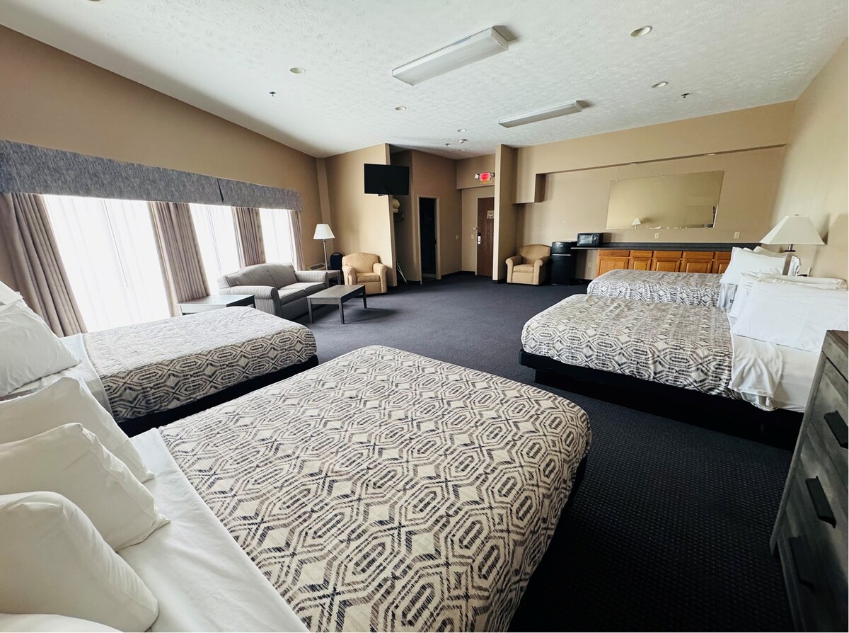Nossa espaçosa suíte para dez pessoas possui quatro camas queen size e um sofá-cama. Este quarto possui uma longa bancada, perfeita para preparar lanches, montar um pequeno buffet ou organizar um espaço de trabalho. Um frigobar e micro-ondas facilitam o armazenamento e o reaquecimento das refeições.