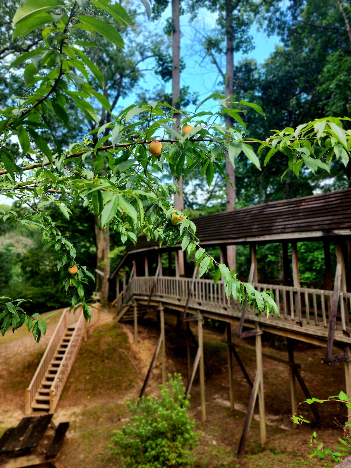 Lindamente situado na McDaniel Pine Farm em Wade, NC, você vai se sentir em casa no Bluff Cottage. Uma configuração de estúdio com uma cama queen size e 2 cadeiras que se convertem em camas de solteiro confortáveis. Há também um colchão de ar disponível. Área de estar confortável com TV de tela plana grande e espaço de trabalho dedicado. Banheiro privativo, chuveiro e uma pequena área de cozinha com fogão, panelas, cafeteira, micro-ondas e geladeira. Belo pátio externo com lareira e acres para passear!
