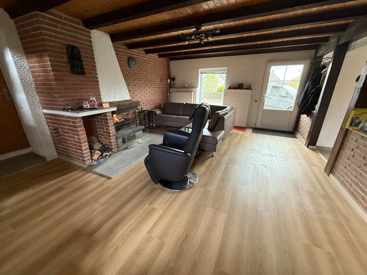 Domicílio romântico em Gut Neuwerk com cama em frente à lareira aberta, banheira independente e sauna. Uma experiência de férias com um fator de carinho e bem-estar para individualistas. Incluído no preço estão: Utilidades, uso de sauna, roupas de cama, toalhas, lenha e isqueiros.