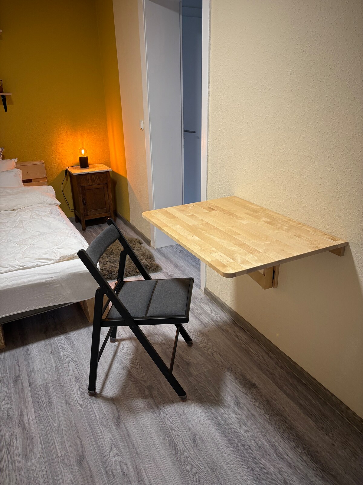 Alugamos nosso pequeno quarto de hóspedes (... é UM quarto, mesmo que o Airbnb liste a sala de estar e o quarto separadamente nas fotos) com banheiro privativo e entrada. O quarto tem uma cama de 80x200 cm, que pode ser rapidamente alargada para 160x200 cm. O quarto tem "apenas" cerca de 13 m² (mais banheiro), mas, por outro lado, tudo o que você precisa para uma estadia curta: um guarda-roupa, 2 cadeiras, uma mesa, geladeira, a possibilidade de fazer café e chá... xícaras, pratos, talheres...